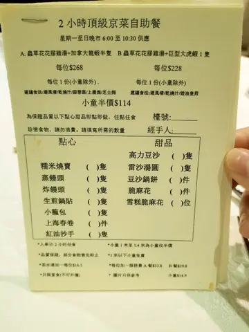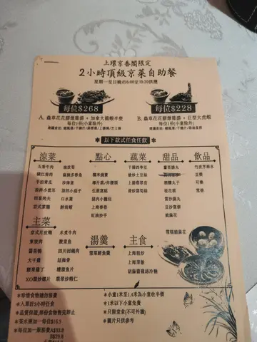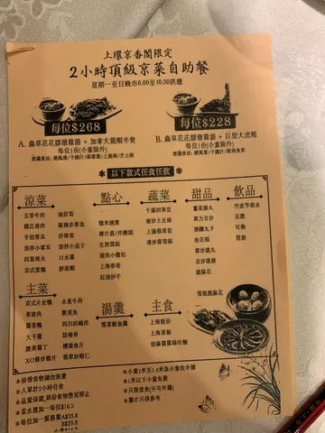 放題見過不少,以食小菜作為放題的還是第一次食,同朋友去完PMQ欣賞展覽後,朋友見我喜歡食小菜,於是帶我來京香閣試試。放題菜單上的食物有不少選擇,上海菜、北京菜、粵菜也可以品嘗得到。先來了幾碟涼菜,鎮江肴肉、四喜烤夫、涼拌小茄子。放題套餐包了每位一份蟲草花花膠燉雞湯和半隻加拿大龍蝦,可選擇避風塘、蒜蓉蒸、豉油煎等食法,我揀了蒜蓉蒸。而朋友就揀了豉油煎巨型大虎蝦,肉質彈牙鮮甜,醬汁並冇掩蓋原來海鮮的鮮味。見到師傅正在切片皮鴨,亦上前排隊夾了幾片,片皮鴨精華當然是在鴨皮,皮脆有光澤,配上京蔥、哈密瓜絲、青瓜絲,塗些片皮鴨醬汁吃,滋味無窮,最受歡迎。另外又點了一些主菜、蔬菜、點心,干扁四季豆、上湯翡翠苗、翡翠炒蝦仁、醬茶鴨、話梅骨、炸饅頭,醬茶鴨吃起來有股薰茶香,肉質挺嫩的,四季豆很脆口。最後梗係要留肚吃甜品啦,桂花糕、酒釀丸子、豆沙鍋餅、雷沙湯丸、雪糕脆麻花,一次過品嘗多款甜品,過足口癮。豆沙鍋餅的紅豆蓉很軟綿,忍不住多吃了兩件,雪糕脆麻花香脆可口,伴雪糕吃一流。兩小時的小菜放題,可以食到多款上海菜、北京菜,又有自家製飲品,確實係幾過癮又抵食嘅!況且坐得幾舒服,唔洗同人逼。…查看更多
