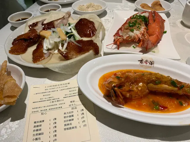 放題見過不少,以食小菜作為放題的還是第一次食,同朋友去完PMQ欣賞展覽後,朋友見我喜歡食小菜,於是帶我來京香閣試試。放題菜單上的食物有不少選擇,上海菜、北京菜、粵菜也可以品嘗得到。先來了幾碟涼菜,鎮江肴肉、四喜烤夫、涼拌小茄子。放題套餐包了每位一份蟲草花花膠燉雞湯和半隻加拿大龍蝦,可選擇避風塘、蒜蓉蒸、豉油煎等食法,我揀了蒜蓉蒸。而朋友就揀了豉油煎巨型大虎蝦,肉質彈牙鮮甜,醬汁並冇掩蓋原來海鮮的鮮味。見到師傅正在切片皮鴨,亦上前排隊夾了幾片,片皮鴨精華當然是在鴨皮,皮脆有光澤,配上京蔥、哈密瓜絲、青瓜絲,塗些片皮鴨醬汁吃,滋味無窮,最受歡迎。另外又點了一些主菜、蔬菜、點心,干扁四季豆、上湯翡翠苗、翡翠炒蝦仁、醬茶鴨、話梅骨、炸饅頭,醬茶鴨吃起來有股薰茶香,肉質挺嫩的,四季豆很脆口。最後梗係要留肚吃甜品啦,桂花糕、酒釀丸子、豆沙鍋餅、雷沙湯丸、雪糕脆麻花,一次過品嘗多款甜品,過足口癮。豆沙鍋餅的紅豆蓉很軟綿,忍不住多吃了兩件,雪糕脆麻花香脆可口,伴雪糕吃一流。兩小時的小菜放題,可以食到多款上海菜、北京菜,又有自家製飲品,確實係幾過癮又抵食嘅!況且坐得幾舒服,唔洗同人逼。…查看更多