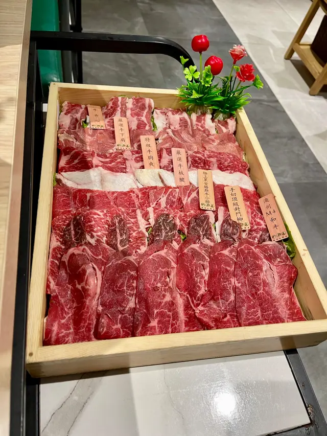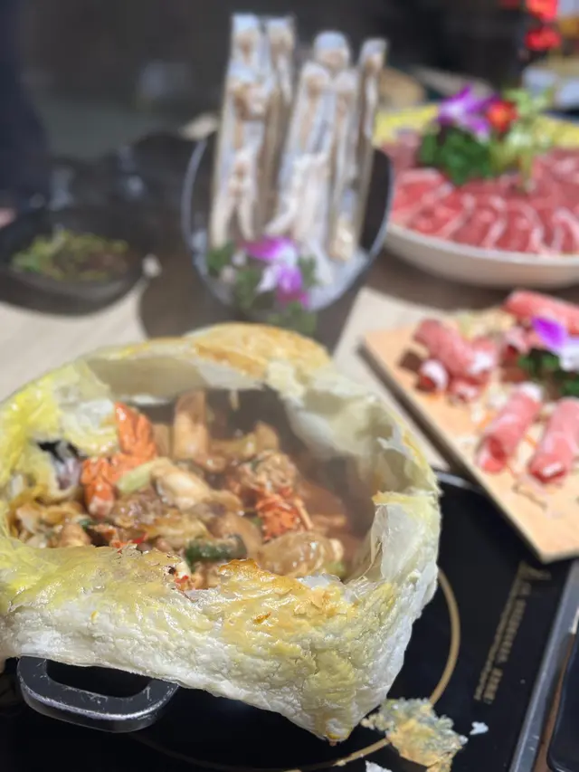 和朋友在尖沙咀逛逛,看見這個酥皮火鍋,感覺十分新鮮,所以就試試這間餐廳。酥皮龍鳳鍋 BB辣 $298.00酥皮、芝士、龍蝦、滑雞配上麻辣湯底。看見這無敵大片的酥皮,層層分明!店員將它切開再放入湯裏。酥皮吸引湯底的精華,而龍蝦和滑雞都岩岩好,不會太韌!由於我們開得太大火,酥皮痴在煲底燶了,店員得知後立即幫我們更換,十分貼心。朋友和我也是食肉獸,所以我們order了三碟牛。它們分別是本地新鮮手切牛頸脊、和牛三寶和至尊牛三拼。本地新鮮手切牛頸脊 $298.0和牛三寶(後腰、上前、極黑板腱)$388.00至尊牛三拼(本地牛、牛小排、和牛)$368.00塊塊肥美的牛肉擺放整齊排列,件件牛味十足。店員推介的牛頸脊陣陣油香,肉質鮮嫩爽滑。而至尊牛三拼的和牛片片雪花肉,牛味濃郁。海陸空拼盤(黑豚肉、雞件、廣島蠔丶虎蝦)$198.00黑豚肉不會比牛肉遜色。廣島蠔和虎蝦新鮮,大大隻廣島蠔滑喐喐,十分鮮甜。查看更多