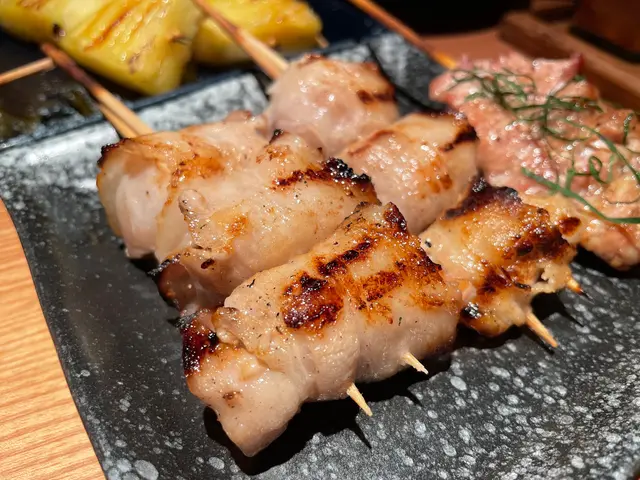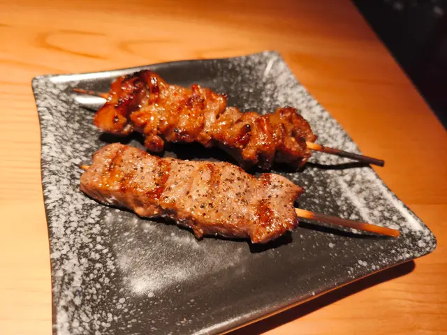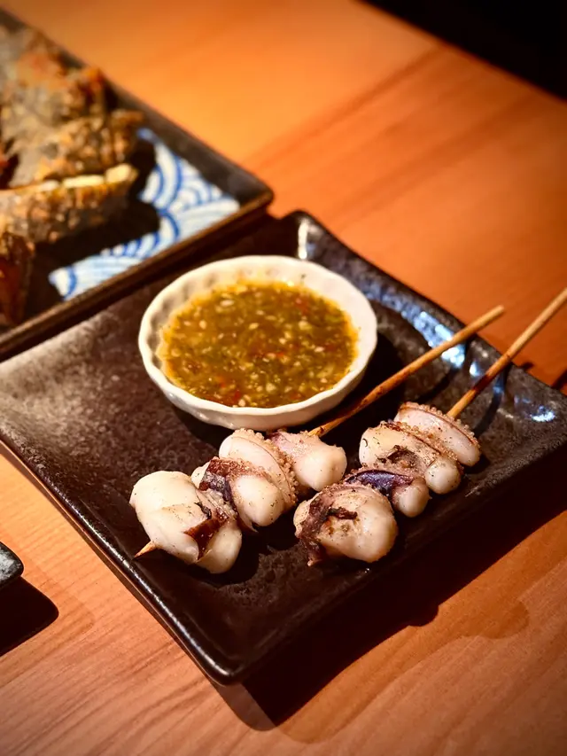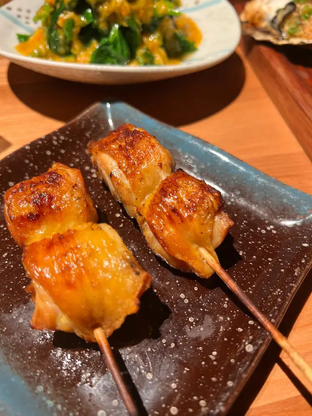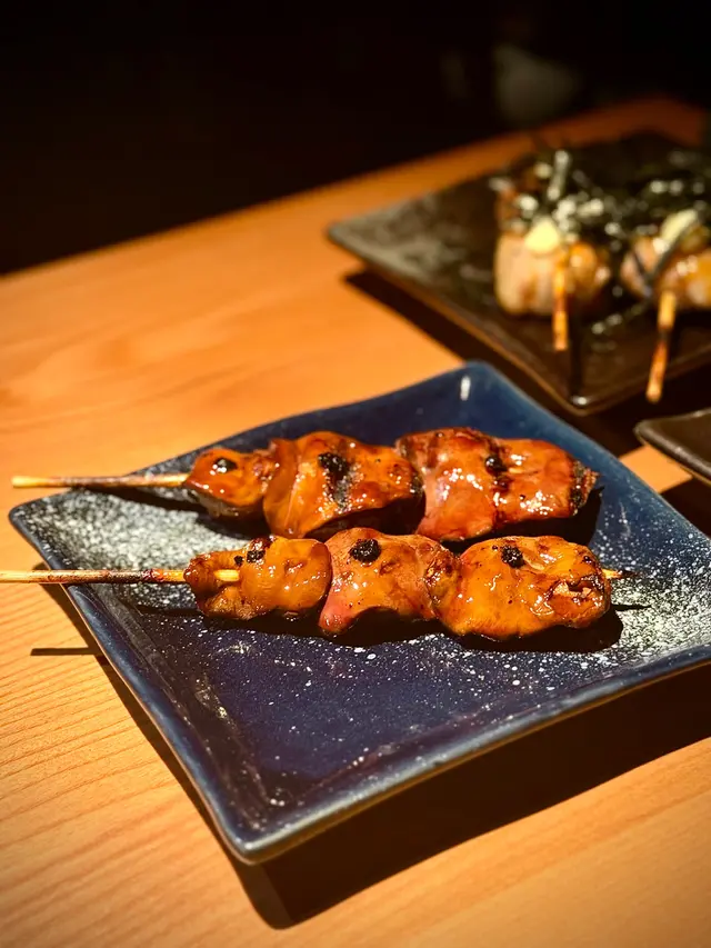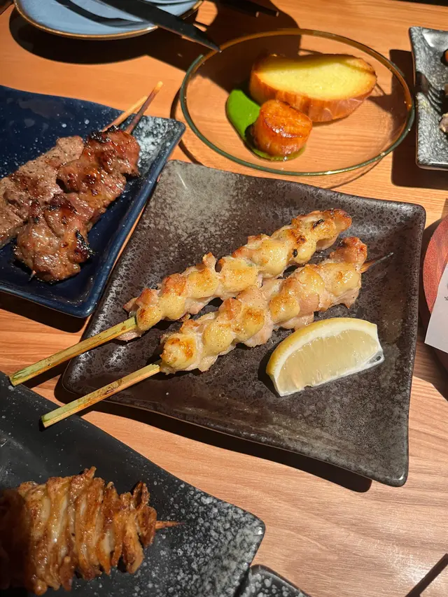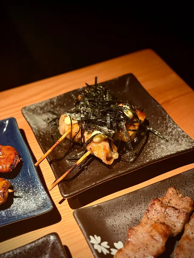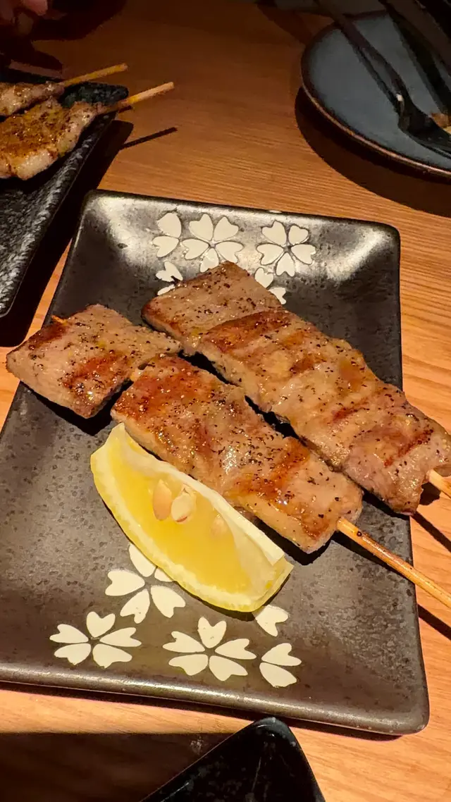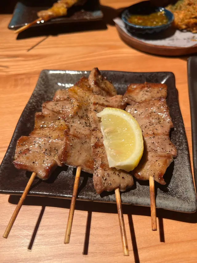鹽燒豬肋肉 $28切到薄身方便入口, 外皮略焦啲位香脆, 入面油潤唔乾~~鹽燒鮮雞頸肉 $28咬落香滑中帶彈性, 好有「筋肉感」
