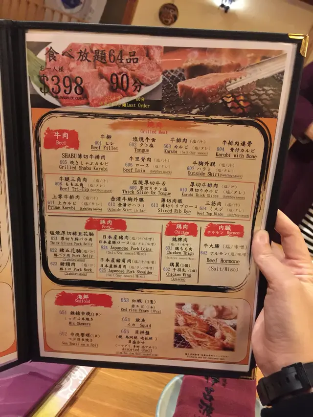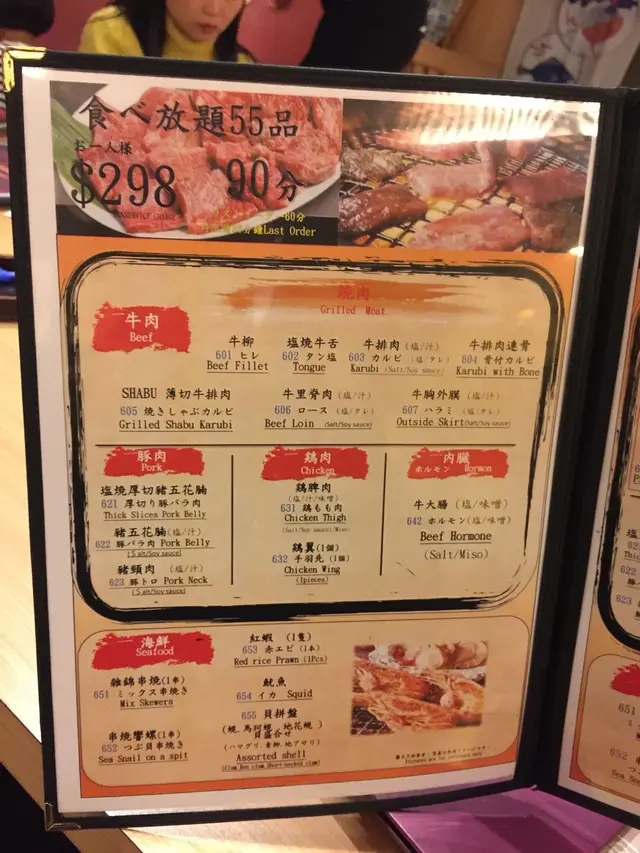 同同學仔片完車,再一齊去尖沙咀食燒肉放題,呢個都係團購嘅,$268一個大人,小朋友無買團購就$164,大人食當日要比$30小費!去到門面好日式,有隻大熊本熊在門口迎賓,入內更驚喜,個場裝修日本和式廳堂,中央有個榻榻米地台,要脫鞋先可以上去,旁邊就分咗幾個有簷嘅小室,有晒門簾,燈光略暗!好有味道!我味坐中間地台,有腳位可以放腳(唔使盤膝!)一條長方枱對坐,好似日本婚宴咁,未有其他客時,地台比我哋玩晒,好free,坐低就落單,有普通(55品)同豪華版(64品),我哋係普通版,限時90分鐘,寫紙仔好快就到!牛肉🐮牛柳鹽燒牛舌:薄切牛排肉:牛排肉牛排肉連骨牛里脊肉牛胸內膜我主打牛肉,連骨嗰款唔喜歡,其他款式都比想像中好,牛肉淋無筋,雖然唔算好雪花(一分錢 一分貨)每款肉味濃,最長最肥嗰款最淋(一次燒得多,燒嘅時間會起大火🔥🔥🔥)牛舌薄,易燒又彈牙,食食食貝拼盤🐚(蜆、馬珂貝、地花蜆)錫紙盤內放汁,幾款貝分唔到,肉唔算肥,不過無沙又無腥,好味!紅蝦🦐好大隻,燒熟肉質爽!好味魷魚🦑無食雞翼🐔無食,食咗嘅朋友話完全無味(雞翼白雪雪)又厚又難燒熟!粟米🌽南瓜🎃枝豆:無食牛舌拌青瓜:牛舌碎唔彈牙,反而似內臟嘅沙沙地,青瓜爽口,麻辣醬汁辣辣地好味!芝士薯餅:無食天婦羅拼盤(蝦🦐茄子🍆南瓜🎃)無食炸豆腐:無食煮牛筋腩:無食燒飯糰🍙配埋醬油同油掃,飯糰自己燒,第一次邊燒邊掃失敗,第二次掃好晒醬油,燒嘅時候唔好經常翻,燒好一面脆才轉面!鹹鹹地脆卜卜好味!白飯🍚無食蛋花湯🍲無食冷麵🍜無食豆腐沙律🥗凍豆腐嫩滑,加蕃茄同洋蔥碎好清爽牛舌沙律🥗無食蔬菜沙律🥗好爽脆,加啲油醋汁已好味可樂、忌廉、雪碧、Ginger Ale:簡單罐裝汽水店員有禮!上食物好快手,唔寫紙開口講都得!好快速!(得90分鐘,你拖我就生氣)小朋友多,難免嘈吵!店員都好包容食物選擇多,水準不錯,服務有禮,環境舒服,一大班人都唔覺迫,正!$268(大人團購)+$30(大人小費)+$164(小童連小費)
