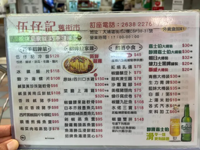 老公約跑友到大埔行山所以約我到大埔市政街市吃飯之前常常幫襯隔離三小姐今晚試下伍仔記因為在openrice看到評語不錯我到達的時候還未及七時伍仔記已經差不多坐滿我坐下後幾乎座無虛席看看餐牌價錢好相宜怪不得人多啦看到隔離兩三枱都叫魚湯所以我也叫了蔬菜石狗公魚湯上桌時嘩真驚喜是奶白色濃濃的魚湯一飲下去熱辣辣非常鮮甜很濃厚的魚湯呢而且看到石狗公已經是碎碎的出曬味還有蘑菇、薑片、絲瓜呢個湯超級滿分🈵我在網上看到好多人都推介腐皮蠔仔卷我也叫了果然是招牌菜腐皮好鬆脆不油膩裏面滿滿是餡料呢不過就有點鹹如果飲啤酒的話就剛剛好我喜歡𦧲骨所以點了椒鹽bb鴿雖然乳鴿不大隻但是也幾好肉而且炸得很乾身但肉又不乾柴真係好好味老公嫌我叫得太多煎炸嘢所以他就點了北菇菜心這個都好好味北菇又爽又滑而且有麻油香味菜心是菜心苗廚房很用心比較大條的菜心還削去外皮呢吃起來一點渣都沒有無論湯、肉類、蔬菜類都做得好好怪不得人流不絕啦…查看更多