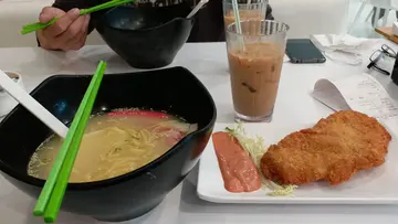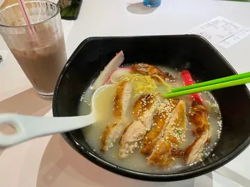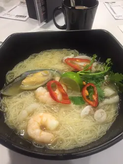 落雨天都唔想行咁遠,所以今日黎左公司隔離大廈既休點食午餐。依到座位都幾多,有啲似canteen既感覺,但唔知係咪因該落雨,差唔多坐滿晒人。午餐選擇同一般茶餐廳差唔多,但價錢好似貴左少少。我就叫左泰式冬蔭海鮮湯米粉,58蚊包埋餐湯同飲品,凍飲唔洗加錢。但食物一上枱,個樣同我平時食既冬蔭公好唔同,雖然聞既時候有冬陰公味,但食落同個樣一樣,味道好淡,唔似冬蔭公味,而且好似用左好多水溝到淡晒。海鮮份量都唔多,蝦係雪藏蝦,青口得一隻,而且啲魷魚好細,似係啲頭頭尾尾整埋一齊,反而米粉既份量就好多。成餐最正常就係杯熱好立克,下次落雨天都係要諗下有冇其他選擇。