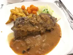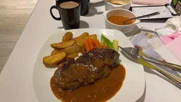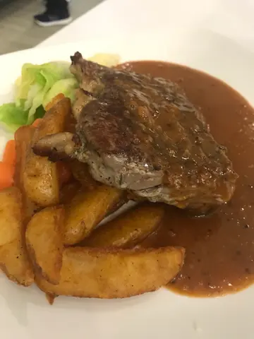 喺九龍灣返工嘅朋友仔,好多人都知道依間canteen。佢係一間好似飯堂咁嘅形式嘅餐廳,但係就比茶餐廳環境好好多同坐得舒服。每逢lunch嘅時候,都幾多人嚟到食嘢。佢有提供早餐、午餐、下午茶,但係就冇做晚餐。我自己一般嚟食,都係食lunch。佢地供應食嘅午餐有好多選擇,有西式、港式,都會有亞洲野,每一日唔同款,大概每日都有肉類扒類、西式飯中式客飯,或者炒粉麵湯麵都有。我個人覺得佢依度嘅午餐,扒類選擇就非常抵,一般只係需要最多七十幾蚊嘅價錢就可以食得大大嚿牛扒,水準都還可以,同出面一般中下價嘅餐廳其實都差唔多,份量仲多D。好似今日嗌左依個雜菌汁西冷,件扒非常大塊,煎到熱辣辣,有肉汁,係無可避免被少少被疏打粉招呼過。可以跟白飯、意粉薯菜。今日叫左配薯菜,有好多配菜,薯角都係新鮮炸起。除咗主菜之外,跟餐仲會配埋例湯,有中湯同西湯選擇,仲送埋飲嘢飲,冷熱冷熱飲品都係同唔使加錢,可以再加錢揀特色飲品。唔收加一,落樓都係幾十蚊,所以呢度都係我其中一間午餐時間嘅飯堂。