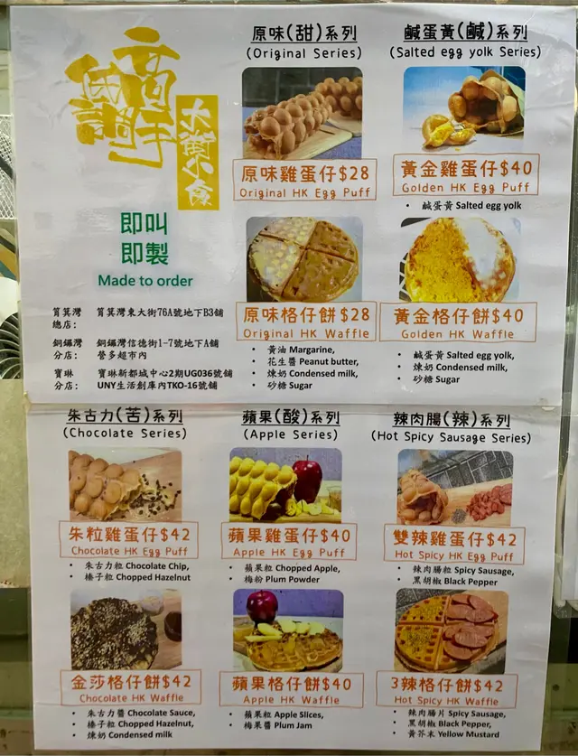 **【原味雞蛋仔】HK$28**   - **外脆內軟**:外殼超脆!咬下去有「咔嚓」聲,內裡半空心的蜂窩結構,蛋香濃郁。   - **甜度**:微甜不膩,適合不愛甜食的人。   - **驚喜位**:邊緣薄脆如餅乾,中心軟糯像布丁,口感對比絕妙!   - **建議**:即買即食,放涼後脆度會下降。     **【黃金雞蛋仔】HK$40**   - **邪惡升級**:在原味基礎上,外層塗滿鹹蛋黃醬再烘烤,撒上鹹蛋黃碎。   - **味道**:鹹甜交織,鹹蛋黃的鹹香超濃郁,尾韻帶微辣(疑似加了辣椒粉?)。   - **亮點**:每一粒雞蛋仔都沾滿醬料,絕不手軟!   - **小缺點**:吃多略膩,建議2人分享。   **🏠 環境與服務**   - 街坊小店格局,即叫即製需等候5-8分鐘。 查看更多