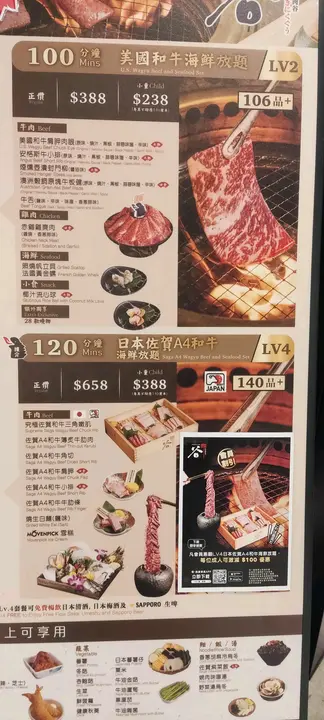 主打日本九州佐賀縣農場空運直送的佐賀和牛,提供無限量的肉類和海鮮放題,讓您慢慢享受100分鐘的滋味。餐牌上有超過140多種菜色可供品嚐,味蕾會忍不住隨著菜式的變化而起舞。