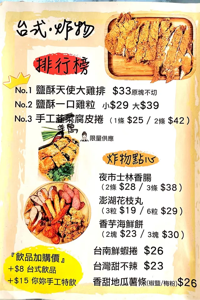 台灣小店 clui1210等級42022-06-03218 瀏覽 關注 超值招牌套餐1號$45咋!我覺得好抵食!夜市鹽酥拼盤便當有台灣香腸、芋頭海鮮餅、甜不辣、滷蛋,仲有個台式飲品,我叫咗冬瓜茶!除咗飯個汁我覺得鹹咗少少之外,其他嘢我都覺得好好食,尤其是係個甜不辣!口感好好!台式飲品雖然係送,但係唔會係死甜嗰隻…查看更多以上食記乃用戶個人意見,並不代表OpenRice之觀點。讚好分享台灣小店 你妳 https://s.openrice.com/QrbT04q1300檢舉 張貼 評分4味道4環境5服務4衛生4CP值用餐方式外賣自取