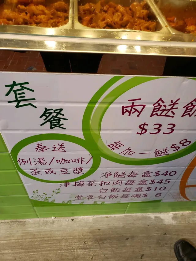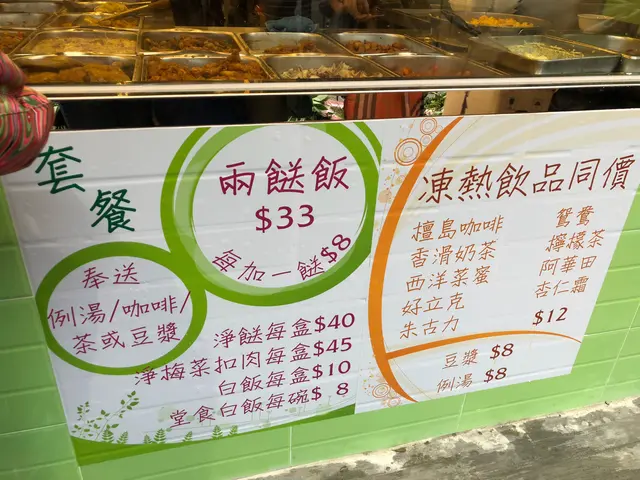 最近轉左係呢頭番工,行過發現好多人排隊就望下,原來賣33蚊既雙餸飯,堂食外賣同價,可跟冷熱飲,中湯或者汽水!價錢上真係非常吸引,餸菜選擇多,擺晒出黎比你選擇。味道比較一般,不過如果你要菜既話都夾好多比你,想食多菜少肉既人不妨可以考慮下。查看更多