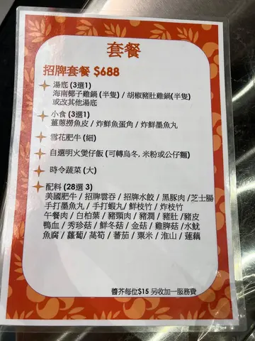 來發係我近排最喜愛嘅打邊爐餐廳,原因好簡單,我俾嘅錢主要係花喺食物上面而唔係環境上面,咁當然餐廳嘅環境亦都坐得很舒服企理理乾乾淨淨 。而且又無限時任坐 。我食來食去都係佢哋嘅椰子雞煲,石橄欖雞煲,但係兩個雞煲都好好食,百食不厭 。睇得出佢哋啲雞係有精心挑選過,有雞味。雖然佢哋肉類方面唔係用啲好頂級嘅質素,但係套餐嚟講咁嘅價錢咁既質地已經好對得住我哋呢啲嘅消費者 。丸類同滑類都好出色,好食!我每次都會食佢哋嘅煲仔飯,唔算好有飯焦,飯粒分明醬油調味好 。今次叫咗個白鱔煲仔飯,臘味都好食 。有段小插曲就係有個姐姐喺我同朋友們食到差唔多嘅時候過嚟收嘢,佢由左邊枱執到右邊枱,我地筆左幾碗起泡既湯底 。唔知佢係咪嫌我地筆得太滿 ,佢一路執一路自言自語,因為佢唔係即刻收走,最後碗湯唔小心倒左啲係朋友旁 。其實我地都好直接,倒瀉左即刻處理左佢便好了,但佢又想解釋 。下次呢啲咁危險既野盡快執左佢就好了 。千祈唔好喺度冉冉洋洋。呢段小插曲並唔會對我哋有影響,下次都會再嚟幫襯 。希望食物質素繼續保持水準,而我又可以試更多唔同嘅湯底。…查看更多