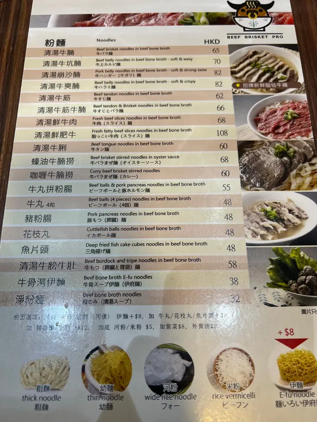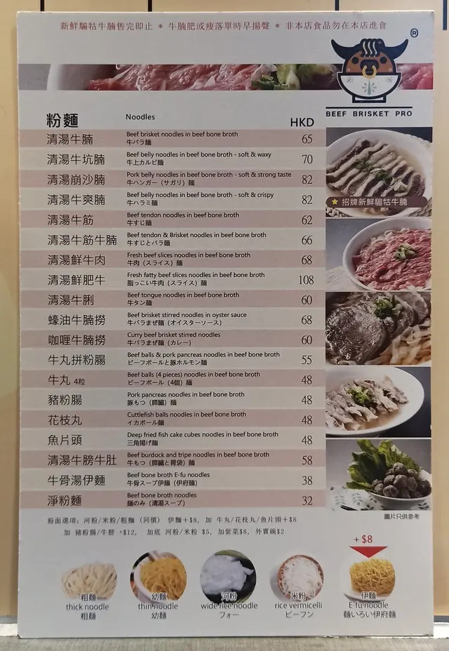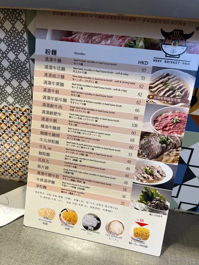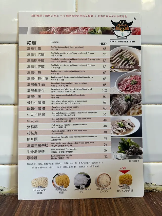 差唔多五點半到,都預咗無得食崩沙腩同爽腩,結果當然真係無啦。清湯牛腩河粉($65)加牛膀(+$12)先試啖湯,雖然話牛骨湯,但牛味欠奉,稍微偏咸但可接受(飲咗半碗,之後沒有勁口渴)。牛腩有七舊(其中有兩舊比較細),要咗肥腩,其實都唔係好肥,牛腩軟腍,但咬落有質感唔係死腍,肉味有但唔算好濃,肥膏位唔油膩。牛膀有三片,粉粉嘅口感,無怪味,不錯。河粉份量正常,頗滑,另外仲有兩片生菜。騸牯生牛肉河粉($65)加牛丸(+$8)生牛肉大約有七八片,肉質十分紮實,要些少牙力先咬得開,但並不是嚡及韌,肉味夠。牛丸有兩粒,勁彈牙,咬開中間有汁,肉丸味濃,味道不錯。老實講,唔係唔好食,味道都尚算滿意,可能比網上嘅評價渲染咗,期望高咗,但結果無預期中咁好味。如果唔使排隊,可以一試。查看更多
