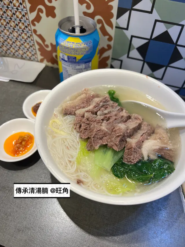 係關注組同youtube入面有一間仲吹到好大完全無負評既舖頭就係旺角既傳承位置係廣華醫院轉入廣華街行幾步路就會係右手面既舖頭望得到前年有一個星期六我去到已經兩點鐘諗住叫做過左午餐時間應該會少d人掛但都排到去隔兩間既模型舖大約等左廿五分鐘先入得餐廳就佈局就係兩邊面壁長檯檯面有筷子辣油牙籤地方少窄餐牌係門口大大個排隊果時可以慢慢研究佢都有寫話係用每日新鮮騸牯牛咁不嬲崩沙腩就係好搶手同數量好少每日限定既產品我兩點半呢個時候已經聽到話最貴既崩沙腩同爽腩都已經賣晒唯有叫坑腩另外可以加八蚊有兩粒牛丸唔知點解定律就係雲吞麵配幼麵車仔麵係配油麵沙爹牛配曲麵而牛腩就係配河粉可能係我以前食開都係垃圾粉麵店呢間河粉唔係散修修可以成條夾起爽口已經覺得好唔錯我人就面盲既唔太識分牛腩同牛坑腩不過呢份就好多肥膏同埋面頭有層薄筋膜牛味好重咬落有口感完全唔鞋唔韌有油脂而且仲係入口即溶既感覺唔會痴牙係好好好食既牛腩份量仲好多另外果兩粒手打牛丸都好爽口咬落好有質感同埋有彈性個湯係清新唔咸有些少鮮味真係第一次食到咁高質既清湯腩幾乎樣樣野都係無得輸難怪都真係無乜人批評個麵70蚊兩粒牛丸8蚊加埋就78蚊可以收八達通如果係呢個質素既牛腩麵就算係幾抵食始終都係新鮮牛仲要高質份量又多絕對夠飽肚好多出名既清湯腩收成舊水添而且旺角仲好方便服務亦都唔係呼喝型唯一唔好就係幾點鐘黎到都係咁多人同埋要一開門先食到好野仲有會係迫些少咁啦但就真係無時無刻都會想再黎排隊都值得既餐廳查看更多