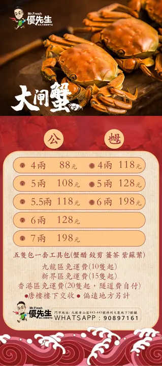 又到食大閘蟹季節,呢間店舖記得上年幫朋友買過嚟食,佢話好多膏,好食,但我就未食過,琴日朋友再去咗呢度買嚟食,見佢影相出嚟好多膏,我見到就好想食,於是今日就嚟咗呢度買嚟食,入到去見到大閘蟹數量唔多,我就買咗一隻五両公,一隻五両乸嚟試吓,兩隻蟹都好足秤,包裝得好好,仲附送紫蘇葉同一包大閘蟹輔料禮包,正所謂農曆「九月圓臍十月尖」,呢段時間食乸係好食過公,今日隻乸係好多膏,多膏到我連佢個肺都搵唔到同埋啲膏真係好甘香,非常好食😋至於隻公相比冇咁多膏,白膏唔多,膏冇咁甘香,到下個月我必定會再嚟買公食。…查看更多