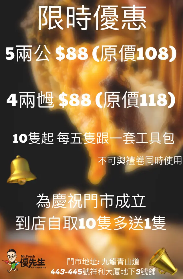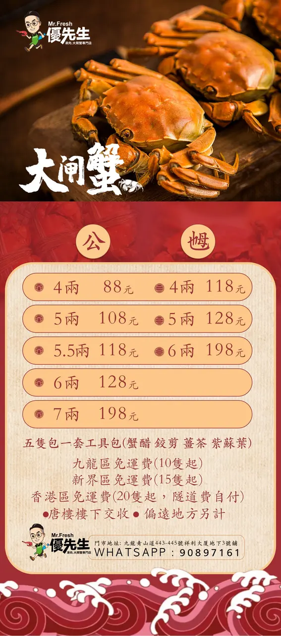 優先生大閘蟹專門店 (長沙灣) 網址: https://s.openrice.com/QrbS0zRi6W0 地址: 香港長沙灣青山道430號祥利大廈地下3號舖 電話: +852 90897161