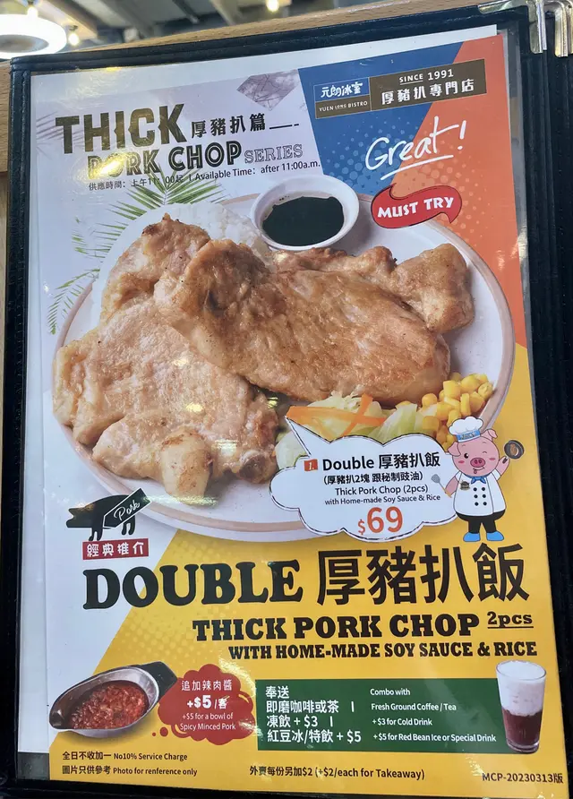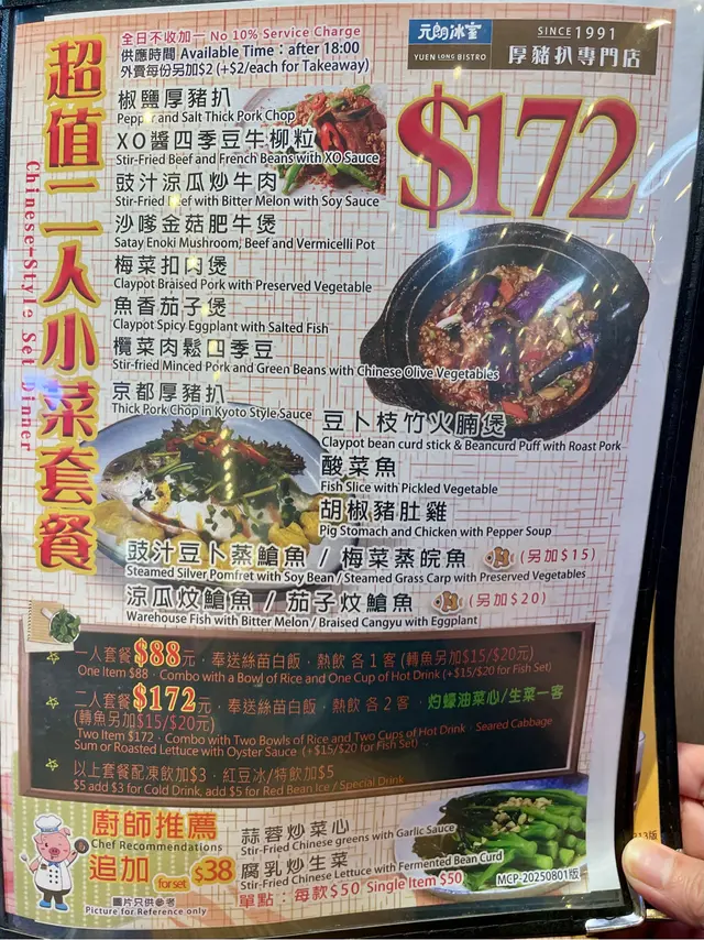 今晚晚餐齊齊去咗間冰室,快靚正,亦平靚正。環境光猛,地方企理,座位唔少,有卡座或長排座位,坐得舒適。晚巿有很多選擇,有幾款招牌厚豬扒菜式、小菜、炒粉麵飯、套餐、常餐、小食都有得供應。禾味燒BB鴿 ($53)雖然細細隻,但相當多肉,皮燒得亮澤香口,肉嫩多汁,味道鹹香,唔駛點淮鹽都夠晒味。Double 厚豬扒飯追加辣肉醬($69+$5)份量十足,兩大塊厚豬扒黃金香口,啖啖肉,充滿肉汁,果然係招牌菜,推介!辣肉醬都好值得追加,香辣惹味,用嚟撈飲一流,食多幾啖,正!胡椒豬肚雞 ($88)先呷啖湯,充滿胡椒香,辛辣暖胃,得!雞雖不算很嫩,但好有雞香;豬肚爽嫩入味,好味!仲有支竹、芹菜、白果、蒜頭等,豐富入味。二人小菜套餐 ($172)揀兩款小菜外,仲送油菜、白飯和熱飲,抵!有多款小菜選擇,點咗黑椒茄子牛仔骨煲,熱辣辣上枱,牛仔骨好惹味,辣辣地!仲有爆香咗嘅洋蔥、蒜子、紅椒、茄子等,鹹香惹味。梅菜蒸皖魚(+$15)即點即蒸,蒸得岩岩好,好嫩滑,伴着梅菜一齊食,最佳拍擋!灼菜心($0/跟餐送)翠綠鮮嫩,份量都唔少,讚!抵食好食!…查看更多