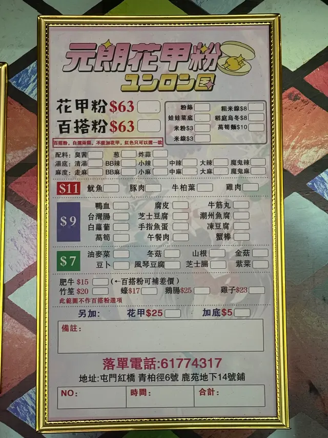 元朗花甲粉 (屯門) 網址: https://s.openrice.com/QrbS05r0F00 地址: 香港屯門青柏徑6號鹿苑地下14號舖 電話: +852 61774317