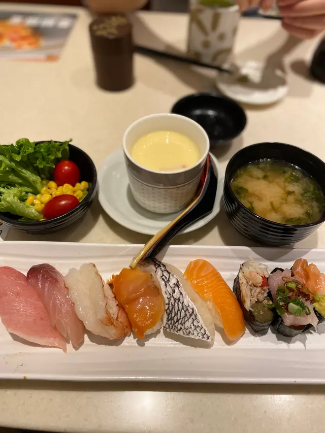 是日到金鐘工作。一行四人諗唔到去邊到食午餐。其中一朋友話佢係元氣會員。係諗唔到食咩嘅情況下。我地去咗食午餐。去到嘅時候門口滿滿都是人。幸好的是我們大概等了十分鐘便可以進內進餐。我們都點了午市定食。午市定食包了八件壽司。一個沙律及一碗麵豉湯。元氣嘅壽司從來唔會令人失望。食得出佢係新鮮。而且款式種類都算多。叫一個餐可以試多種唔同嘅壽司。沙律食得出青瓜新鮮,咬落去非常爽口。撈埋啲蟹籽一齊食有一種特別嘅感覺。麵豉湯就比較咸咗少少查看更多
