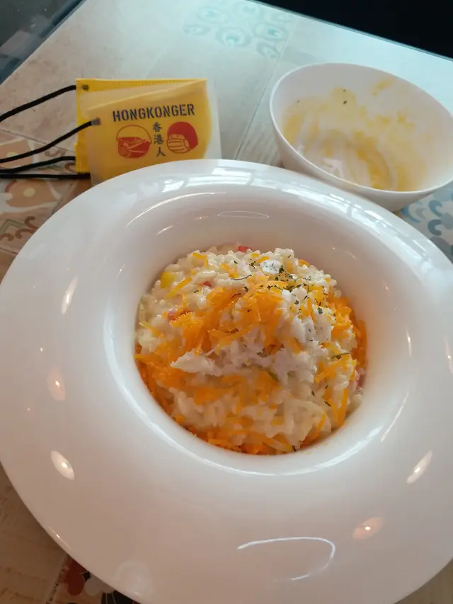 噚日14-4-2022(Thur)又返公司做嘢,都唔帶飯出嚟搵嘢食,唔知食咩好,去麵道(https://www.openrice.com/zh/hongkong/r-%E9%BA%B5%E9%81%93-%E6%B2%99%E7%94%B0-%E6%97%A5%E6%9C%AC%E8%8F%9C-%E6%8B%89%E9%BA%B5-r530663)啦,但我搵唔到,而經過呢間,就睇睇menu,然後決定食呢間.入到去舖頭唔,一眼就望晒,老闆娘即刻走出嚟招呼,坐低後,佢俾張menu嚟時,都講低加$10.00有湯同嘢飲,而今日係南瓜湯.再詳細睇完後,就決定要$69.00O嘅C,鹹蛋黃蟹肉忌廉汁意大利飯,加$10.00飲嘢,要熱奶茶.冇耐,南瓜湯到嚟,呢個稠杰度啱啱好,亦飲到南瓜味.等咗一段時間,鹹蛋黃蟹肉忌廉汁意大利飯到嚟,份量唔係多,鹹蛋黃同蟹肉忌廉汁意大利飯都幾夾,但飯都幾硬同食到米味.食完後,熱奶茶都未到,於是同老闆娘講聲,轉頭就有喇.呢個茶味較濃,有少少苦,要加少少糖至得.環境:雖然唔大間,但啲凳係坐得舒服嘅.查看更多