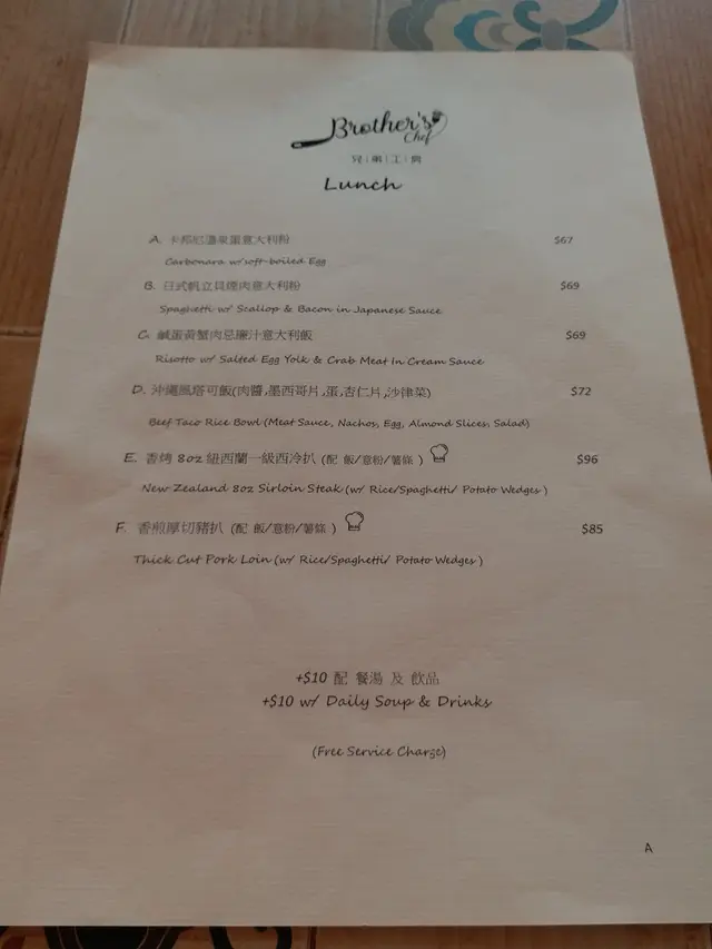 今次我約咗係石門返工嘅朋友食lunch, 咁附近多寫字樓食飯, 周圍都好多人要等位, 所以我都早咗半個鐘出嚟搵定位等; 我本身已經有首選係食呢間兄弟工房, 但點知都係full house, 不過服務員都好好, 雖然話後面仲有1pm嘅Booking, 但都肯俾我留電話有位再通知👍🏻👍🏻咁等嘅期間諗住搵吓有冇其他餐廳有位啦~點知我準備入另一間餐廳嘅時候就收到電話話有位, 咁我就即刻狗衝返去兄弟工房😍入到去其實間餐廳好細, 得20幾個位左右, 有啲逼, 我哋三個人都係叫左set lunch, 都有加$10 包餐湯同飲品, 但係有啲失望嘅係….呢間都算係cafe啦~但點知冇latte, cappuccino個d咖啡, 淨係得茶記野飲😔我同朋友都係叫左西冷扒配薯菜$96 睇相的而且確係有啲膠, 似人地日本display😂但係其實佢份量都好足夠, 一個portion 有1塊半牛扒👍🏻味道都唔差😋但係肉質就麻麻地👎🏻有啲韌, 不過呢個價錢已經算唔錯😌另外, 我老公揀左厚切豬扒飯$85反而呢個有驚喜😍豬扒口感好夠冧又夠juicy👍🏻只係味道差dd唔夠入味, 但唔鐘意食咁濃味嘅人就覺得ok👌🏻呢個lunch 價錢一般, 我推介嘅話, 會覺得豬扒好食過牛扒🐷🐷🐷雖然佢2款扒個汁都係一樣架!查看更多
