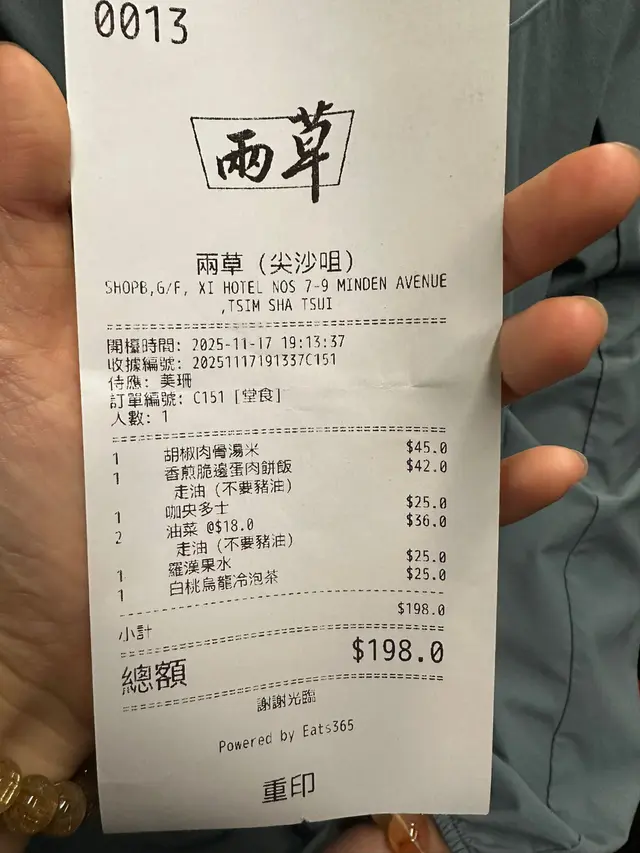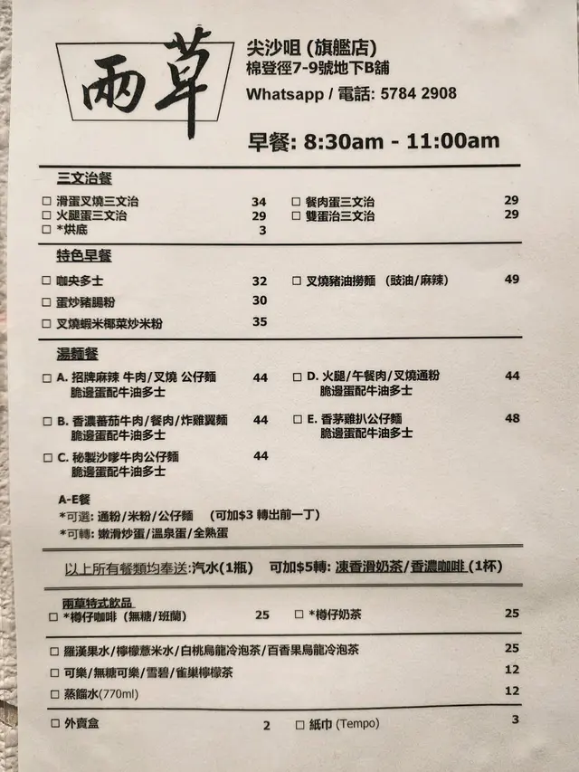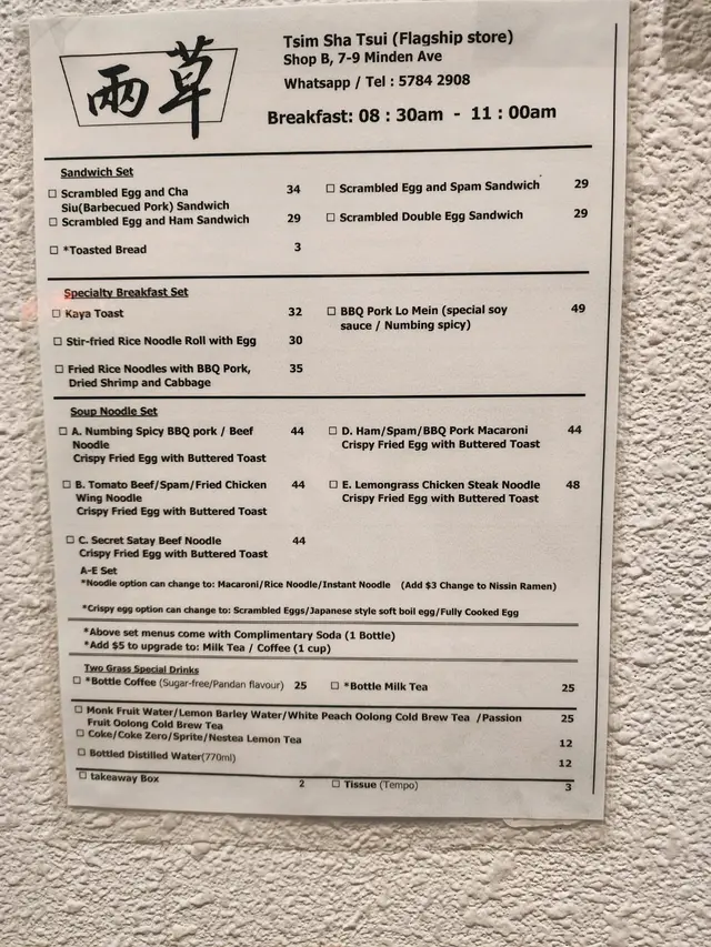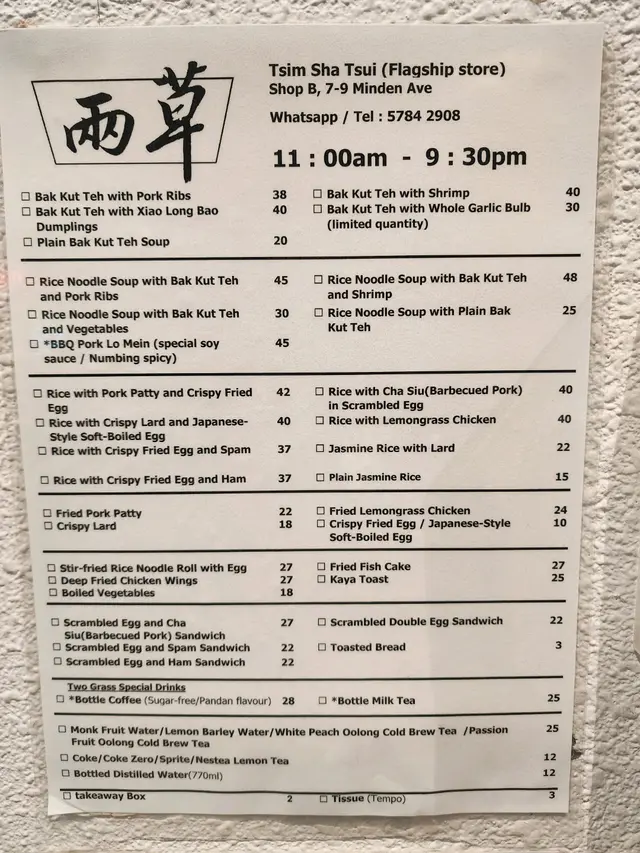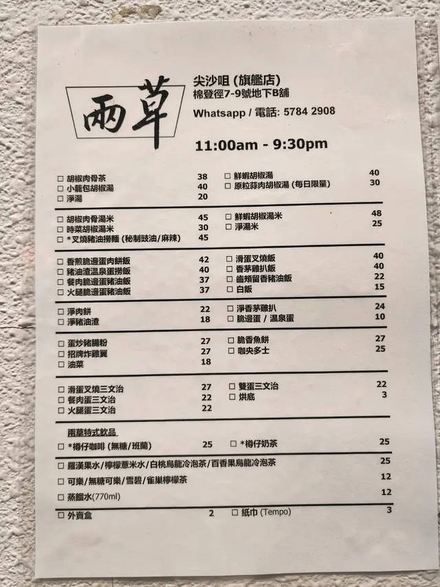 兩草 (棉登徑) (尖沙咀) 網址: https://s.openrice.com/QrbS0gZeD00 地址: 香港尖沙咀棉登徑7號地舖 電話: +852 57842908