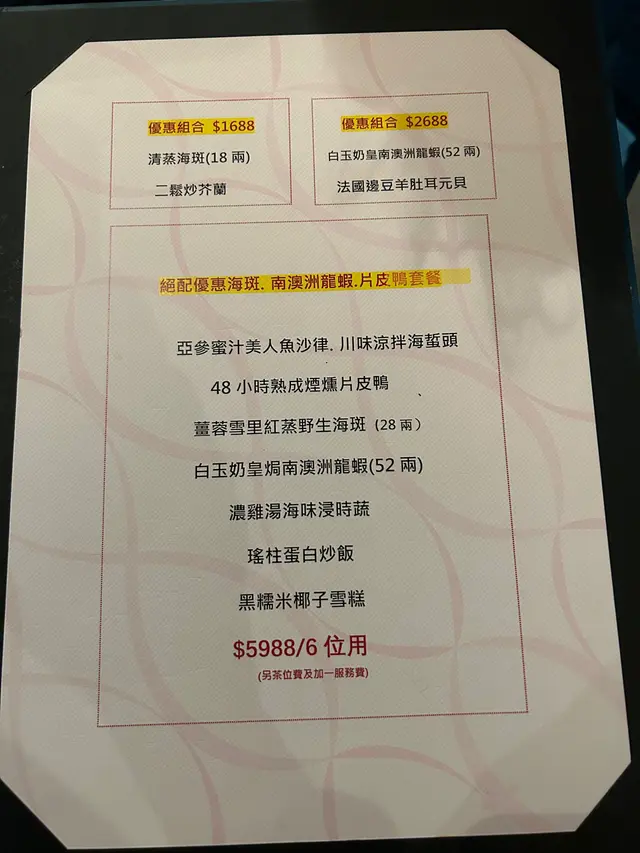 This restaurant is located at 4/F Harbour City, specializing in seafood. It is part of the Maxim Group, and while we have visited the adjacent Singaporean restaurant a few years back, it is our first time coming to 818 The Seafood.Walking past the fish tank at the entrance, the staff leads us to the main dining room, with a few VIP rooms which offer more privacy on the side. The décor is nice, classy but relaxing. The highlight is certainly the harbour view, and we are fortunate to get a table on the window side, allowing us to enjoy the sunset and beautiful night scenery.To start we have Deep-Fried Shrimp Roll 酥炸五香蝦棗 ($78). Thinking it would be like those we have in Chiu Chow restaurant, it turns out to be quite different, more akin to the style for the Cantonese deep-fried oysters with crispy batter. The taste is decent, but the shrimp roll has too much fatty pork in my opinion.We also order a Combo Set ($1,888), which includes Braised Hanasaki Crab with Sarawak White Pepper 砂撈越白胡椒花咲蟹半隻. The hard and spiny shell has been cracked open to make it easy to enjoy, and the meat is sweet, with firm texture, where the white pepper sauce gives fragrance but not spicy. The other dish in the Combo Set is Stir-Fried Chinese Kale with Garlic and Pork Lard 拍蒜油渣炒芥蘭. The vegetables are tender, nicely seasoned, with the pork lard in particular giving rich aromas and flavours. While it looks simple, it is a wonderful dish.Feeling still a bit empty, we also ordered Sauteed and Deep-Fried Flat Rice Noodles with Clams 酥炸花蜆鴛鴦脆皮河粉 ($198) to wrap up. The rice noodles are served in two styles, one deep-fried to offer a crisp texture, the other stir-fried with sauce to remain soft and moist. Cooked together with the large clams so the noodles can absorb the umami flavours, it is delicious. I would prefer less deep-fried and more sauteed noodles, but we applaud the creativity that goes into this dish.Service is decent, with the staff being courteous but did not offer much introduction to the dishes. The bill on the night is $2,428. The customers are basically all tourists and business people, but I think it is a good place for bigger groups to enjoy fresh seafood. Not exactly wow, but can try it out.…查看更多