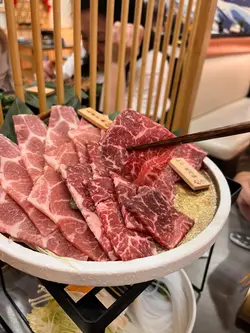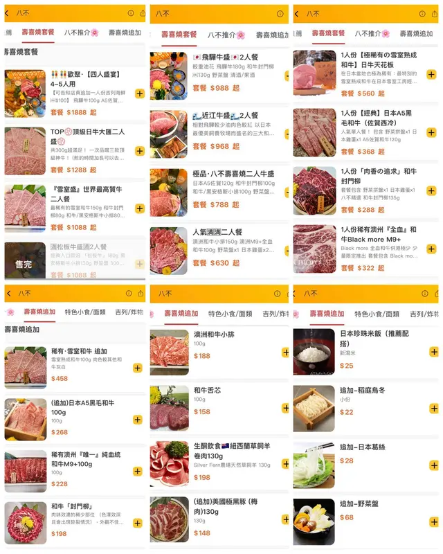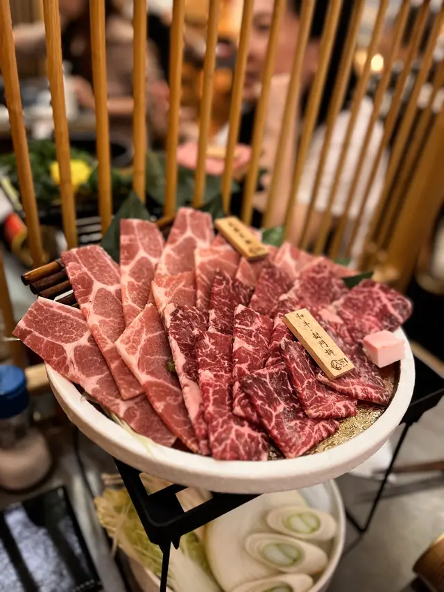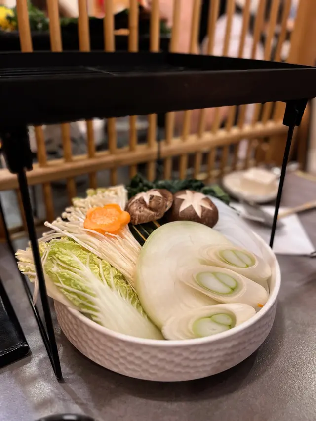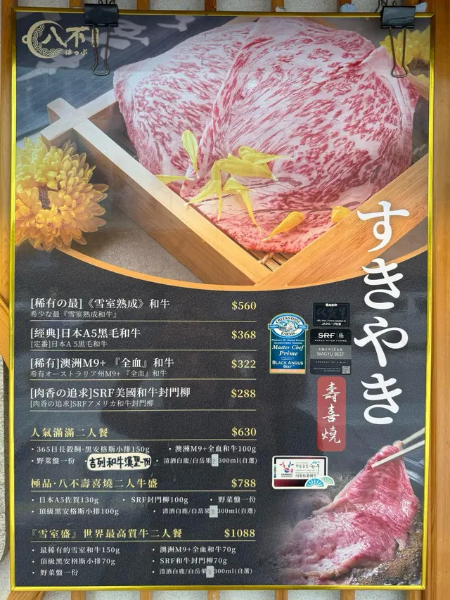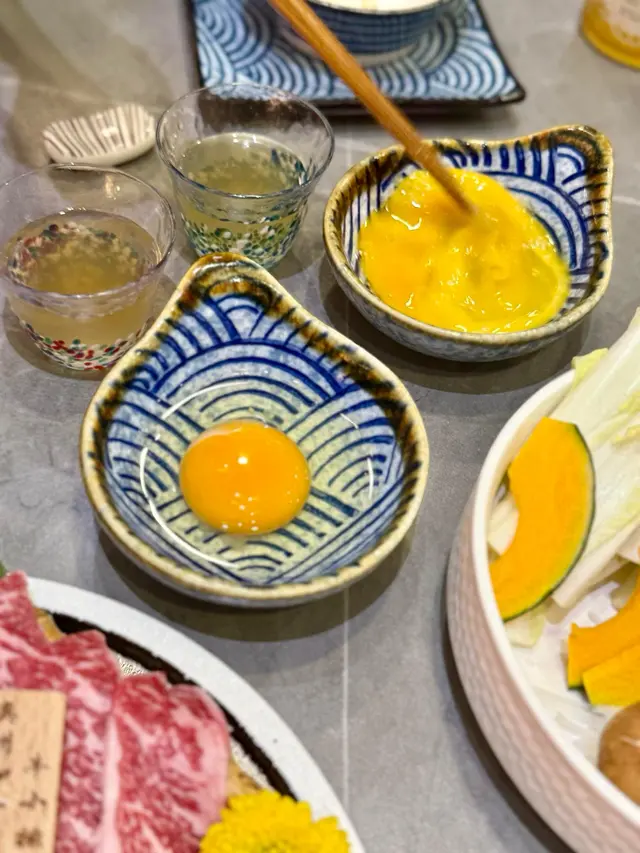 餐廳採用淺木色裝潢,拉開趟門可以看到牆身有日式和風圖案的壁畫,整間都充滿日式風味。外面比較多吃烤肉火鍋的餐廳,而主打壽喜燒的餐廳確實相對來說比較少,而且餐廳主打關西風的壽喜燒,同類型餐廳一般都要收加一服務費,但這間餐廳是免加一的,算起上來更加划算唷!♡壽喜燒套餐$788極品•八不壽喜燒二人牛盛一次過可以嚐到三種不同味道的牛肉,包括和牛封門柳、澳洲和牛牛小排和A5佐賀牛。可以看到三種不同牛肉的紋理油花,和牛封門柳肉色較為鮮艷,牛肉質結實,澳洲和牛牛小排,肉質軟腍,牛的油脂味濃郁,而來自日本佐賀縣的A5佐賀牛則有細膩的口感。比較起上來,我和家人最喜歡油脂味豐富的澳洲和牛牛小排。把牛肉等食材沾上雞蛋漿,除了可以中和壽喜燒醬汁的鹹甜味之外,也可以增加滑溜的口感。另外附上兩個用日式陶瓷樽,一個是清湯,一個是壽喜燒醬汁,可以隨個人口味倒進鍋裏。還有豆腐和野菜拼盤,有蔬菜、冬菇、南瓜、金菇、紅蘿蔔、麵,如果不想要這個拼盤的話,可以加錢轉做其他牛肉,選擇更加有彈性唷!另外我們點了一個♡茶碗蒸$28開開胃,茶碗蒸裏有櫻花蝦、帶子、鳴門卷、冬菇、蔥,整體感覺水份偏多,如果少一點水會更加好吃。然後再吃了一碟♡挪威三文魚刺身$78,共有八片。而飲品方面,我們點了清酒白鹿,配牛肉小酌一下,滿滿的日式味道啊!