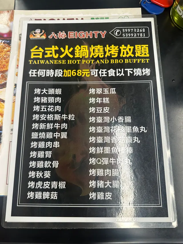 八拾台式火鍋燒烤放題 (旺角) 網上訂座享低至9折優惠兼賺Rice Dollars 網址: https://s.openrice.com/QrbS0YIiF00 地址: 香港旺角彌敦道601號創興廣場1樓117-121號舖 電話: +852 39973268