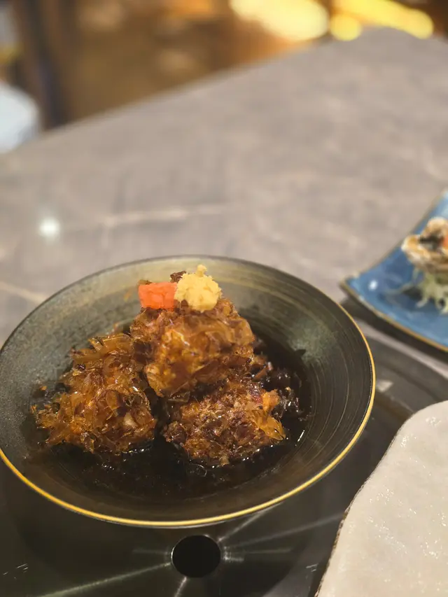 人大咗就少咗見朋友,會珍惜每一次見面。今次同一位多年冇見嘅朋友見面,就同佢食佢好中意食嘅日本菜。八焱居酒屋環境寬敞,員工非常友善又體貼👍🏼✿ 八焱卷 $128卷物十分高級😳表面有海膽同埋燒過嘅鵝肝,卷物裡面有青瓜🥒生菜🥬魷魚🦑材料十分豐富,海膽都算新鮮,魷魚同樣。✿ 土佐豆腐 $68表面有大量木魚,木魚連同豆腐一齊油炸,十分香口,豆腐外脆內軟,湯汁系味噌湯,豆腐吸收後濃郁非常。✿ 紫蘇雞皮蝦 $58紫蘇葉係日本菜常見食材,香氣獨特。原隻蝦用雞皮包住,雞皮爽脆,而且蝦肉新鮮🦐✿ 黃金焗蠔 $68即是芝士焗蠔🦪芝味非常🧀蠔肉肥美且飽滿,店員話可以食一半,另外一半汁用黎撈沙律食🥗仲食到煙肉碎🥓確實不錯👍🏼✿ 日本雞頸肉 $38雞頸肉口感實在,外皮焦香,裡面略帶油脂。✿ 甲羅燒 $88甲羅燒配鱈魚乾,甲羅燒喺日本菜當中向來好受歡迎,將蟹籽,蟹肉,蟹膏混合後,再沾上鱈魚乾,鮮味非常🦀✿ 牛肉稻庭烏冬 $108牛肉系似平時食戈種壽喜燒牛肉,肉質肥美,稻庭烏冬索曬湯汁充滿日式風味~…查看更多