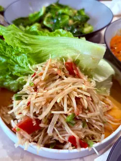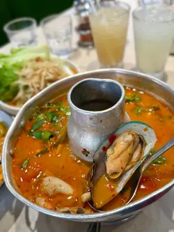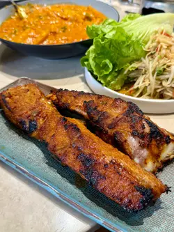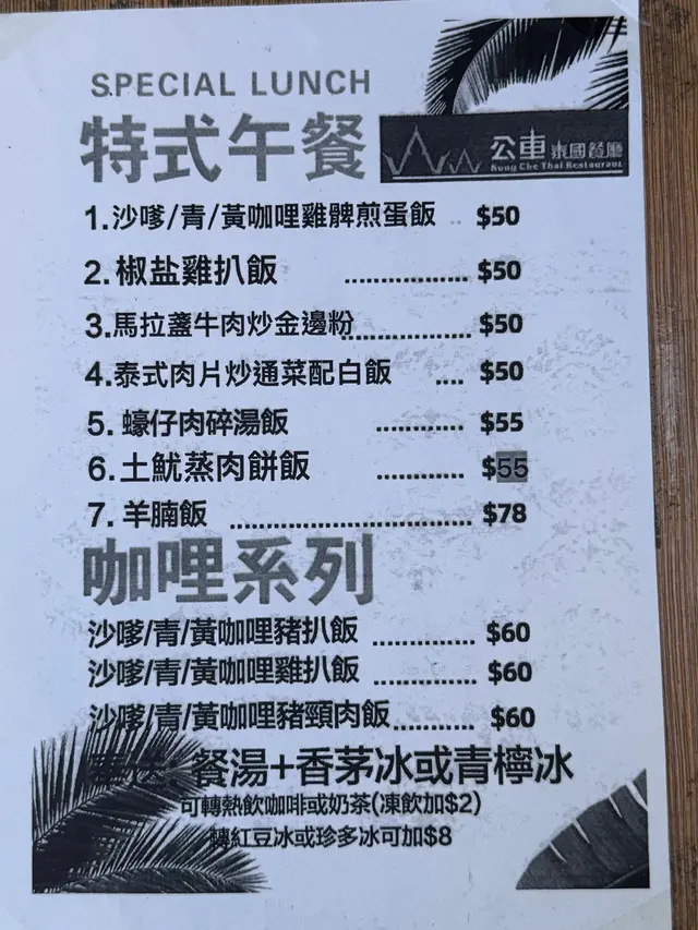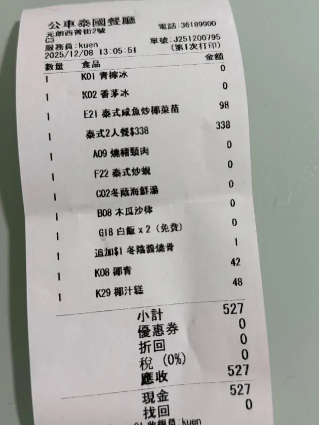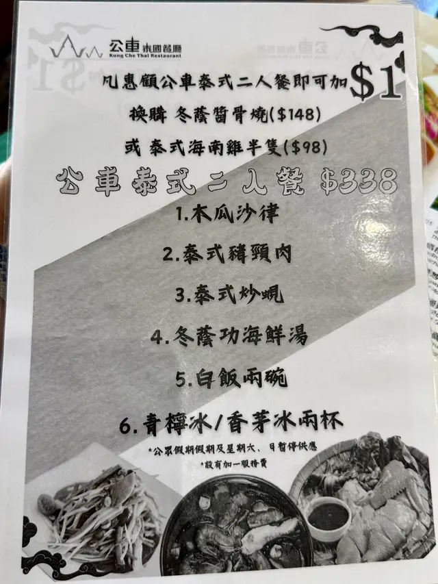 今次去元朗公車泰國餐廳,主打貼地實在啲泰菜,價錢親民之餘選擇夠多,啱晒朋友拍拖放工輕鬆食一餐☺️ 二人套餐$338份量好夠,兩個人食得啱啱好又有驚喜,加埋店內氣氛舒服,坐得鬆動,成晚都食得開心滿足😋先來木瓜沙律開胃,清清爽爽一拌就好醒神,做前菜一流,慢慢食慢慢傾都唔怕膩呢🥗。跟住係泰式豬頸肉,份量實在,係套餐入面嘅人氣之選🤤原本想試泰式炒蜆,不過餐廳話今日冇晒,貼心即時轉咗咖喱海鮮,入面有蝦、有魷魚同青口,換得啱位又豐富,抵讚👏冬陰功海鮮湯都包埋,夠晒熱辣惹味,湯料齊全,飲一啖就暖笠笠,兩碗白飯就啱啱好襯返,啖啖滿足🍲飲品方面有青檸冰同香茅冰,冰涼清新,食完辣辣地嚟一口,瞬間解膩又醒胃,配搭周到🧊最吸引係一蚊加購優惠,冬蔭醬燒骨或者泰式海南雞半隻二揀一,我哋就揀咗半隻泰式海南雞,份量豐富,食落更覺得套餐性價比高👍除咗套餐,我哋仲另外加咗泰式菠蘿炒飯、蒜蓉炒芥蘭同細嘅小食拼盤📸。菠蘿炒飯粒粒分明,夠晒吸引,一上枱就已經有滿滿泰式氣息,岩哂happy share🍍。蒜蓉炒芥蘭清爽爽脆,齊整又見心機,成餐有菜有飯有湯,均衡得嚟唔失滋味🥦小食拼盤就好有驚喜,集合串燒、蝦片、魚餅、蝦餅同春卷,細份但款式齊,啱哂邊傾計邊夾住慢慢試,超級豐富又滿足🤩 如果人多少少,其實仲有泰式四人餐$598,餐點會升級之餘,都可以用$1加購冬蔭醬燒骨或者泰式海南雞一隻,影餐牌就搞掂,幾班朋友分攤就更抵食🧡呢度真係高質抵食,想搵元朗泰菜據點,呢間值得收藏✅…查看更多