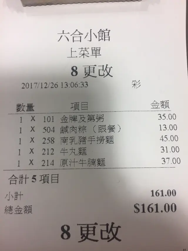 貨真價實 Agentj等級12017-12-262K 瀏覽 關注 小弟三十多年食麵之經驗,今日的確大開眼界。若此店不是附近唯一粥麵舖無對手下,相信早已經閉業大吉。撈面份量跟湯麵一樣,少了些湯,價錢卻貴了。南乳豬手,得三小塊,豬手白雪雪,淡而無味。金牌及第粥,鹹鹹鹹,碗淺粥少。失望。鹹肉粽也只有一塊小肉。無奈。…查看更多以上食評乃用戶個人意見 , 並不代表OpenRice之觀點。1分享貨真價實 六合小館 https://s.openrice.com/QrbT0yNEM00檢舉 張貼 評分1味道2環境2服務2衛生1抵食用餐途徑堂食