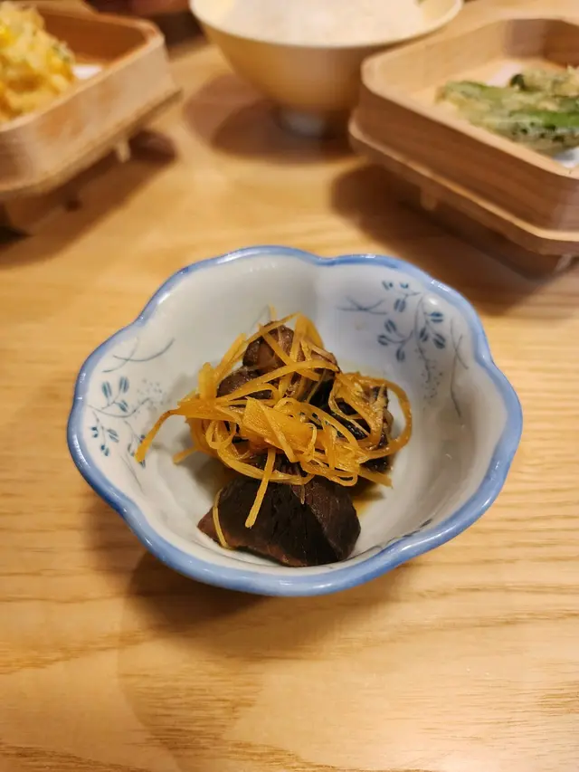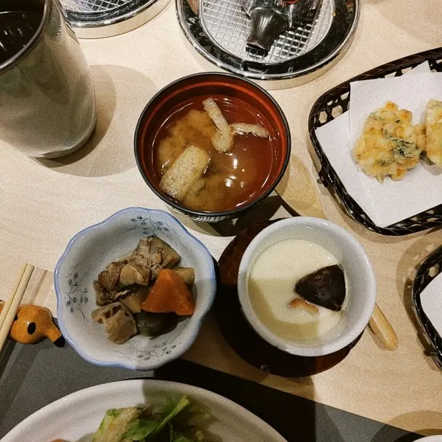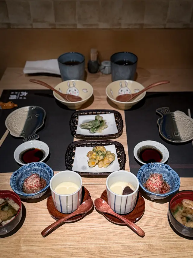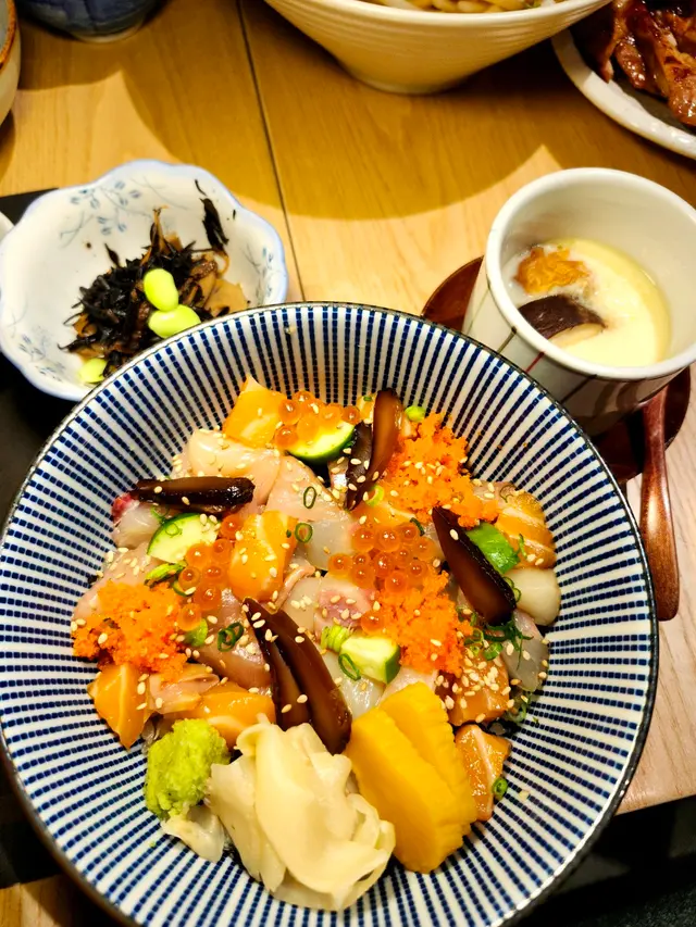 估唔到前菜就有驚喜🤎✨粟米天婦羅 黃金外脆天婦羅炸漿,包裹濃濃粟米香,系由一粒一粒粟米🌽整成黃金粟米餅✨明太子青椒天婦羅用日本迷你青椒仔,再釀入明太子,一咬開見到一粒粒有小小辣辣地的明太子,非常惹味爽口✨前菜昆布湯汁煮蘿蔔配蜆肉✨茶碗蒸好合我胃口 滑滑溜既蛋上有我最愛嘅鮮冬菇好match吖!面豉湯~正常發揮唔會太咸👍🏻角切魚生飯 「不旬不食」日式料理之靈魂✨[六角]嘅角切魚生飯魚生種類豐富,包括三文魚、油甘魚同吞拿魚等,幾款魚生結集一起,易入口鮮味之余,又不失嚼勁 ,搭配醋飯,酸甜適口,非常開胃,最正嘅就系少少飯,多多魚生,CP值滿滿✨照燒雞扒嫩滑雞扒,煎至金黃焦香,外層微脆帶焦糖色,內裡嫩滑多汁,美味鰹魚湯底配上滑溜Q彈烏冬豆腐雪糕大豆的香味還在中慢慢散髮,感覺清新又健康。咖啡雪糕食落口感焦香濃郁好好味查看更多