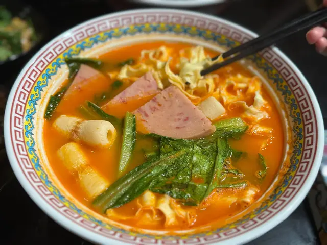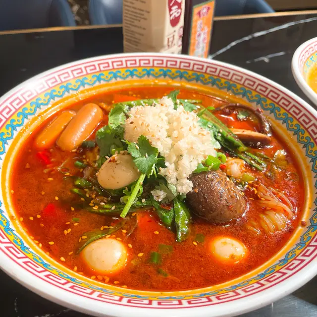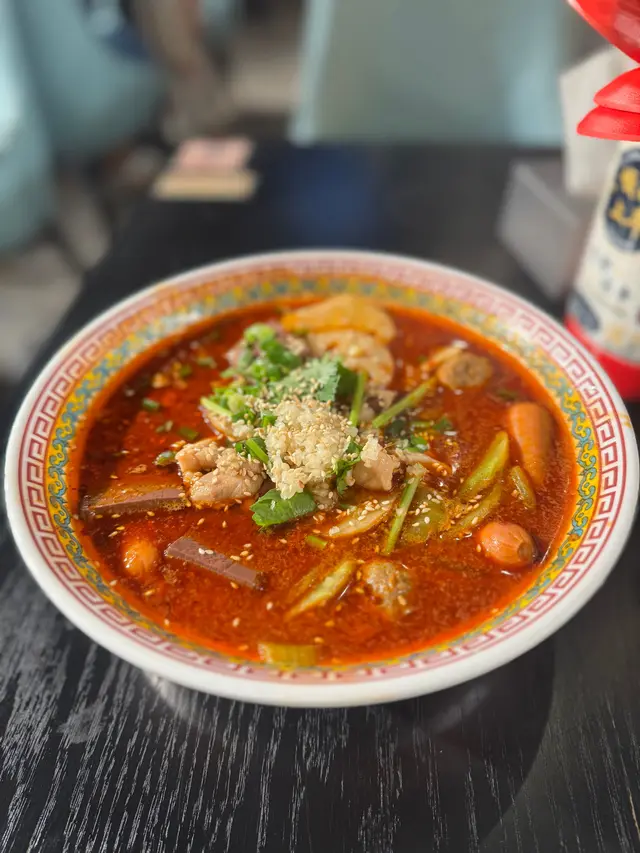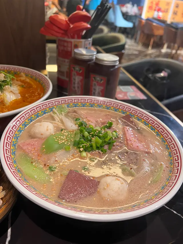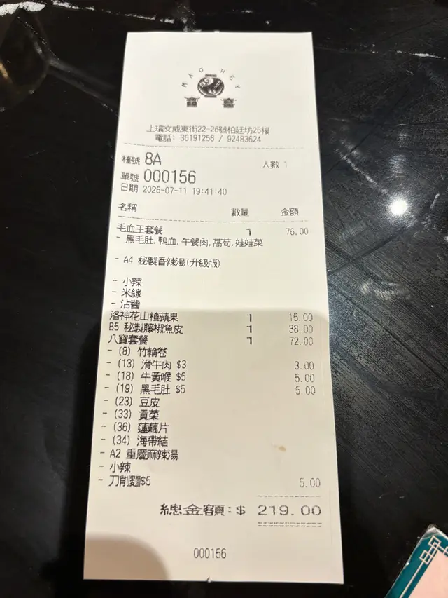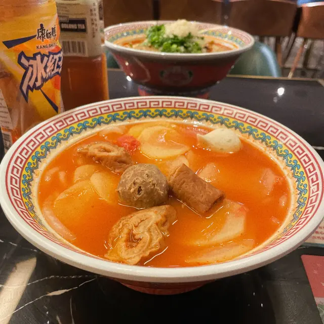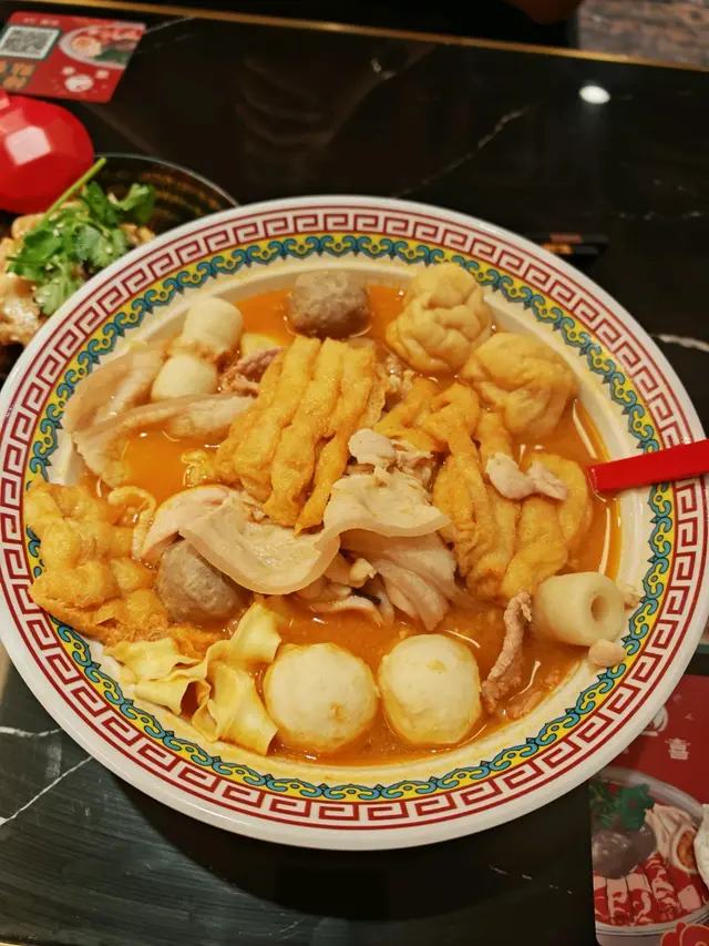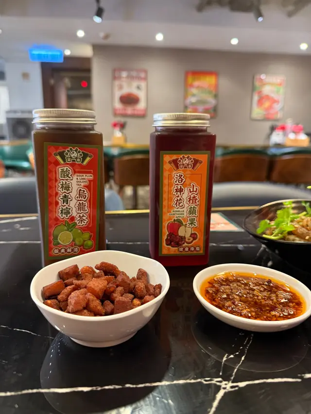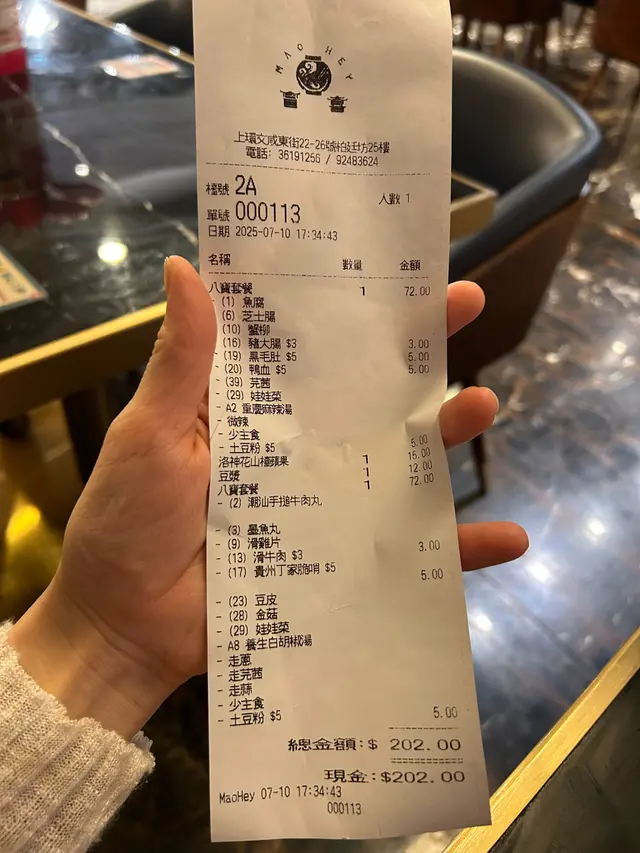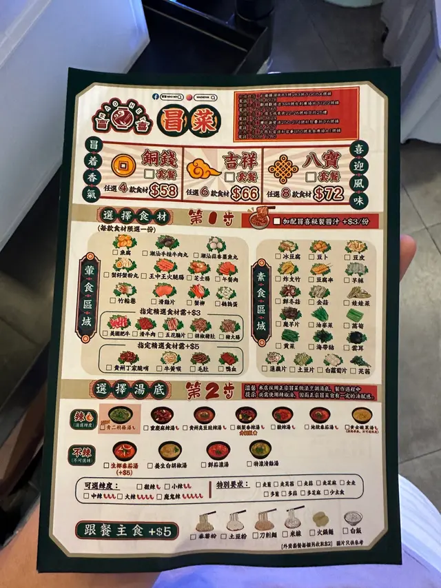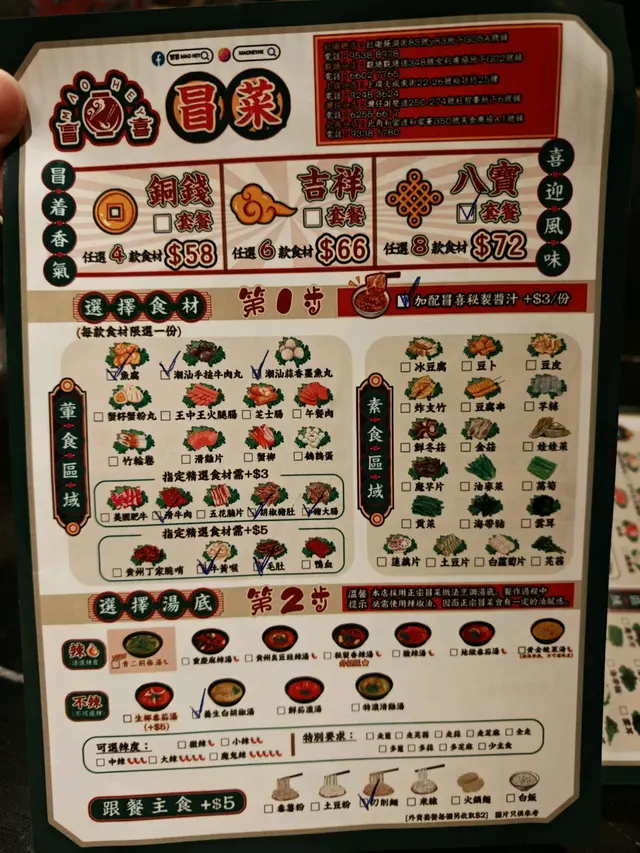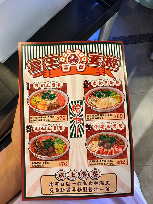 上環嘅冒喜整體感覺真係幾特別!今次叫咗佢哋嘅人氣套餐同幾款加餸,價錢合理,食物選擇多樣。朋友揀咗唔想揀菜就選咗牛魔王套餐有美國肥牛、滑牛肉、毛肚、潮汕手抽牛肉丸同牛黃喉,肉質新鮮,肥牛切片油花分布均勻,涮一涮即熟,好滋味值得推介系生椰香茄湯以為系椰菜點知系椰子湯底,帶椰香,甜味配辣味湯底好調和,第一次食呢一種蕃茄配椰子口味嘅湯底,超驚喜,覺得一定要試,最尾系完全一的冇淨飲曬湯底牛丸比想象中彈牙,有很重的牛肉味薯粉好掛湯我就想試多幾款唔同嘅嘢,就揀八寶套餐,可以任選8款菜式包括了魚腐、潮州蒜香墨魚丸、鵪鶉蛋、滑牛肉、豬大腸、 脆哨、牛黃喉同白蘿蔔片。各款配料都幾有特色潮州蒜香墨魚丸,蒜香濃郁,咬落彈牙,非常有嚼勁另外又叫咗魚腐,魚腐軟軟滑滑,完全吸曬湯汁的味道滑牛肉嫩滑,入味得宜,豬大腸同牛黃喉處理得乾淨冇腥味,口感彈牙。牛黃喉感覺有一啲似魷魚,爽口彈牙,覺得好好食另外發現咗一個好特別嘅配料初頭以為呢個係花生原來就係貴州丁家脆哨乜嘢系脆哨?原來就好似豬炸豬油渣咁樣,食落好香好脆,仲可以一樽樽咁樣賣就都幾方便湯底選擇帶微微辣味嘅養生白胡椒湯,真係重胡椒味,越食個人越嚟越熱,超暖胃飲品叫咗自家製洛神花山楂蘋果,帶點酸甜,清爽解膩,夏秋轉季飲正好,飲品樽裝好可愛餐廳全日免加一,都幾抵食👍…查看更多