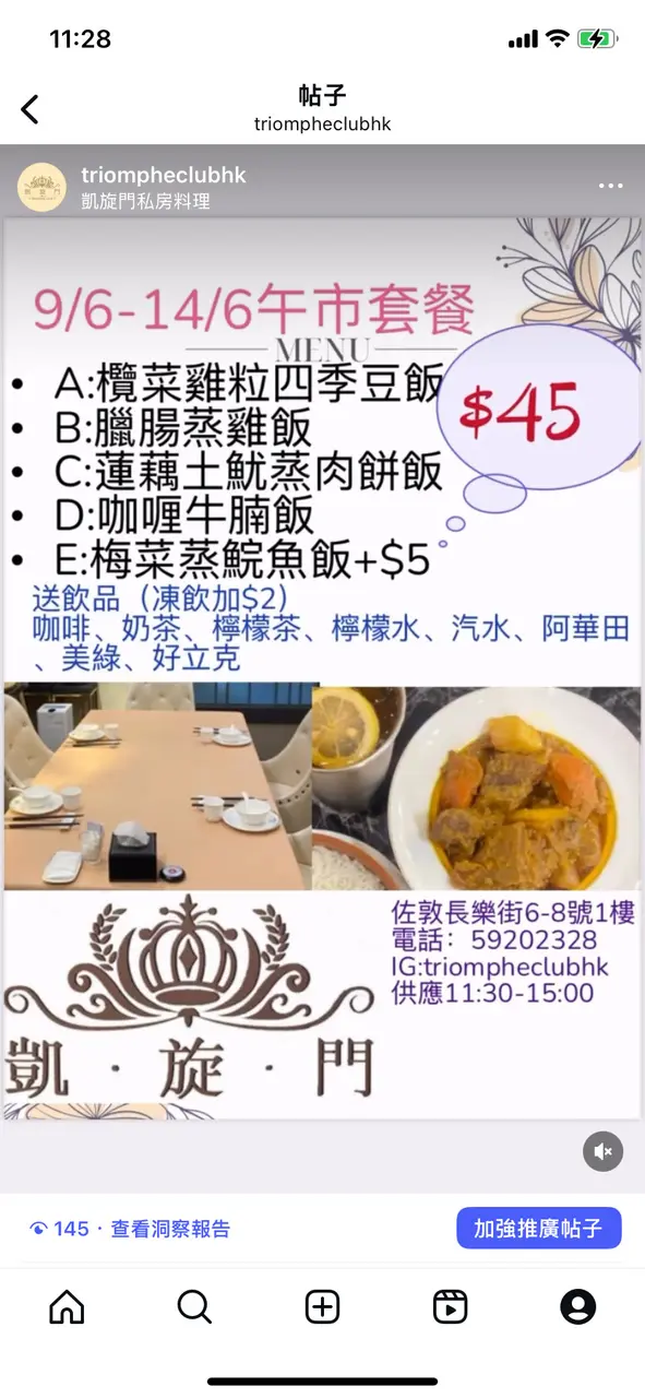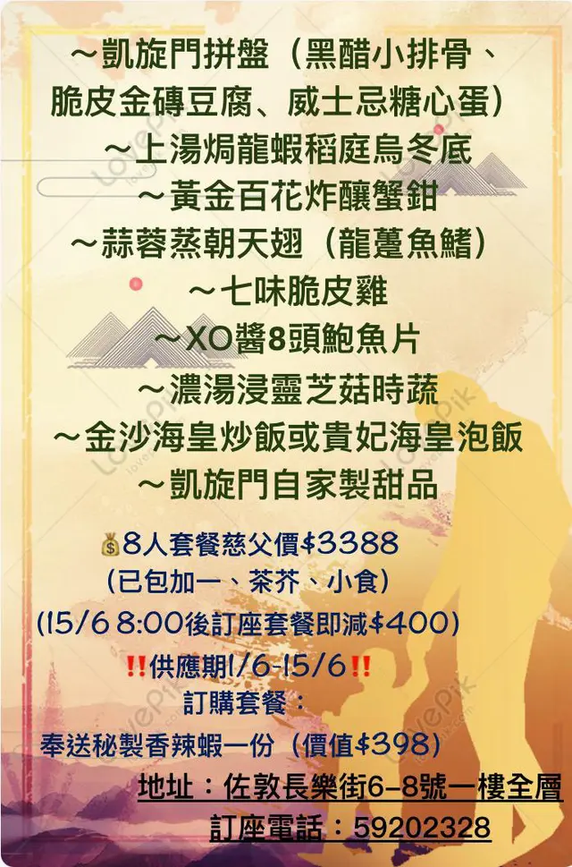 凱旋門私房料理 (佐敦) 網上訂座即賺Rice Dollars 網址: https://s.openrice.com/QrbS0UnOA00 地址: 香港佐敦長樂街8號文興樓1樓 電話: +852 59202328