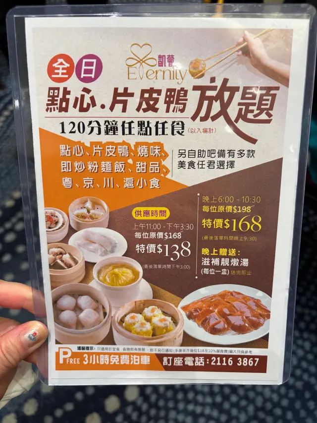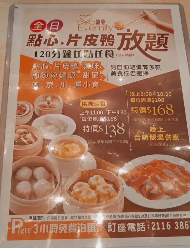 我哋喺網上平台訂咗$138放題午餐,滿心期待的片皮鴨真的不知所謂,四個人佢限定每人得3 片,即係12片片皮鴨,但只係上4塊包皮!同經理反映:你要問我攞就得㗎啦!咁點解你唔上足12片呢? 感覺鴨肉並不是新鮮片皮鴨,而且醬汁有點酸,完全係唔想食第二轉,非常失望。餐前小食都算多選擇,但係個咖喱魚蛋啲魚蛋係霉嘅!雞翼呀、啊豬肚絲啊、還OK嘅。炸茄子啊,咖喱角春卷個皮係非常之硬。點心放題,我哋11:05坐低,肯定唔夠10分鐘我哋就遞交點心紙,但張點心紙放喺我哋枱面嘅時候,上面寫住列印時間係11:38 !所以佢真係去到11:50幾分先至上點心俾我哋!質素數量還OK。但選擇冇預期嘅多,得20幾款,並不是60幾款!總括而言,$138加$18茶位再加16.8(原價嘅+1 )每人其實$172 ,並不是想像中的平因為唔止我哋一台追點心,所以啲服務員都懶得理我哋!總之服務又唔完全到位,點心數量及質素只係一般,賣點嘅片皮鴨令人失望!…查看更多