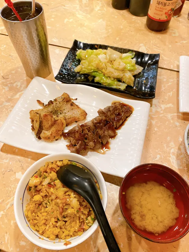 Weekday同老公下就2pm 去呢間食鐵板燒。環境都叫做寬敞,當時冇乜其他客人。我哋叫左個皇牌套餐。首先上左個和風沙律、麵豉湯同三色刺身,呢几樣野食嘅質素就不提也罷(系最平民食肆嘅質素)。畢竟醉翁之意不在洒,呢d side dishes 質素就算麻麻地都可以包容嘅。老虎大蝦🍤:咬口爽脆、蒜頭加上醬汁係個鐵板上面抄啊抄抄啊抄、虎蝦夠晒大隻咬囗非常充實,雖然係冰鮮蝦仍不失蝦味。醬汁嘅配搭又剛剛好,吾會太搶蝦味,整體滋味。南非鮑魚:大大隻爽口彈牙鮑魚,獨特嘅味道加上喺鐵板上面燒,帶少少燒焦味但係又好清新。法國鵝肝:Standard水準和滋味,因為鵝肝本身一個咁好嘅食材基本上上得鐵板燒都會係好食,而今餐個鵝肝大小都系可以嘅,好味和牛燒+茶美豚茶美豚呢個品種嘅豬豬嘅飼料都好講究架!佢地係食橡果長大,又會系飼料中加入綠茶葉,令佢地嘅肉質細嫩無渣,富肉香卻不羶。一般豬肉都會煮到十成熟,而呢隻靚豬豬七成熟就可以入口㗎啦,而且肉質嫩滑鮮甜。日式炒飯今餐炒飯嘅醬汁仲加咗之前上的虎蝦嘅蝦膏落去炒,干身炒飯粒粒分明,很滋味總體來說,性價比很高的一餐,但份量不是很足夠,如果是胃口輕大的朋友,吃完也未必夠飽!可能胃口較大的朋友要另外再散叫一些配菜才足夠飽!查看更多