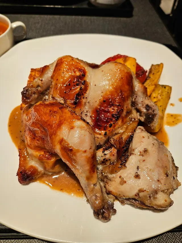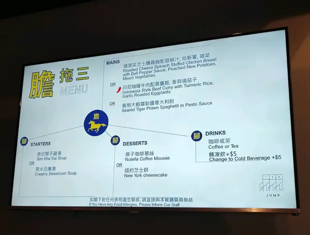 已到過沙田馬場的喜馬當先及百勝廳用餐,今次來到餐點價位更為大眾化的出閘JUMP。JUMP的模式偏向快餐店形式,先到收銀處點餐,然後自行取餐。在網上訂座時已付款,所以在收銀處是主要是為凍飲加錢而付款。進出餐廳的識別label以打開了的閘廂為設計,配合餐廳名「出閘」。當日適逢《寶馬香港打吡大賽》主要賽事,每位價錢為HK$220,一般普通賽事的賽馬日每位價錢則為HK$170,價錢相差得不會太過份。這個價錢是膽拖三的餐飲組合, 一份主菜拖一款餐湯、一款甜品及一杯飲品。日間賽事的午餐供應時間為12:00 - 15:00,15:00開始轉為供應茶餐。茶餐必須預訂,每份另加$46,而我們這次並沒預訂茶餐。雖然JUMP的價位相宜,但餐廳的佔地都廣,座位亦不少。除了有寬闊的露台位置,可讓食客直接觀看賽道上的實事外,還有樓上一層會用作課堂場地之用來講解賽馬。意式燴燒牛肉配薯仔蔬菜,有3大塊牛肉,賣相不錯。醬汁味道香濃,薯仔烤得香又帶點微脆,惟牛肉稍稍overcooked,肉質韌,不夠軟稔,有點失色。芥末籽燒原隻春雞配忌廉薯扒意大利瓜,燒春雞都幾大隻,燒得皮脆肉嫩,仍能保持肉汁!芥末籽醬香濃惹味,與燒春雞的味道很夾!忌廉薯有薄薄一層脆脆芝士面,薯仔香滑,富有芝味。這隻「膽」完勝!餐湯有匈牙利牛肉湯及蘆筍忌廉湯,各點兩碗。牛肉湯內有些薄碎牛肉片,入口有淡淡牛香。忌廉湯一碗太鹹,一碗正常,要自己將兩碗溝勻。甜品是脆皮朱古力泡芙及藍莓芝士餅 (低糖),朱古力泡芙的脆皮面猶如菠蘿包那種脆皮,泡芙微暖,內裡有流心朱古力漿,味道OK。反而低糖藍莓芝士餅比想像中好吃,本來怕低糖的味道會好淡,結果出來的味道剛剛好,不會淡亦不會太甜膩,藍莓醬亦滿滿,好吃!飲品質素則屬正常。可以拖的三隻「腳」,也能讓人選到不錯的「腳」啊!但整體食物水平有點不平均呢~~…查看更多