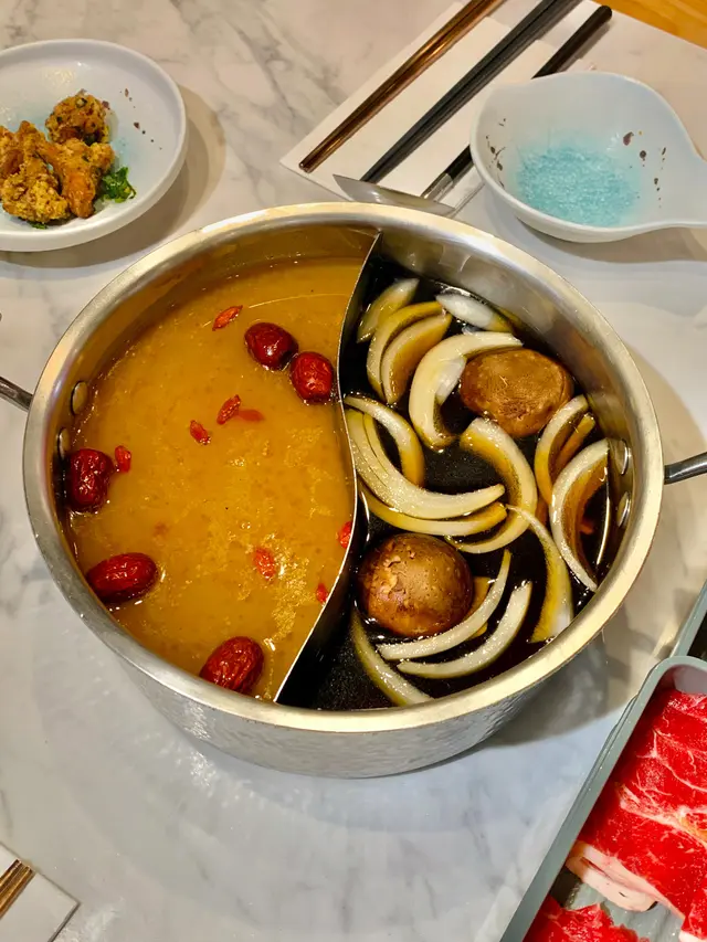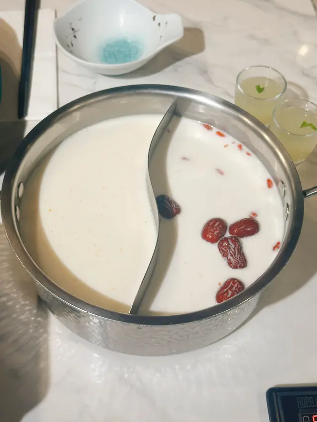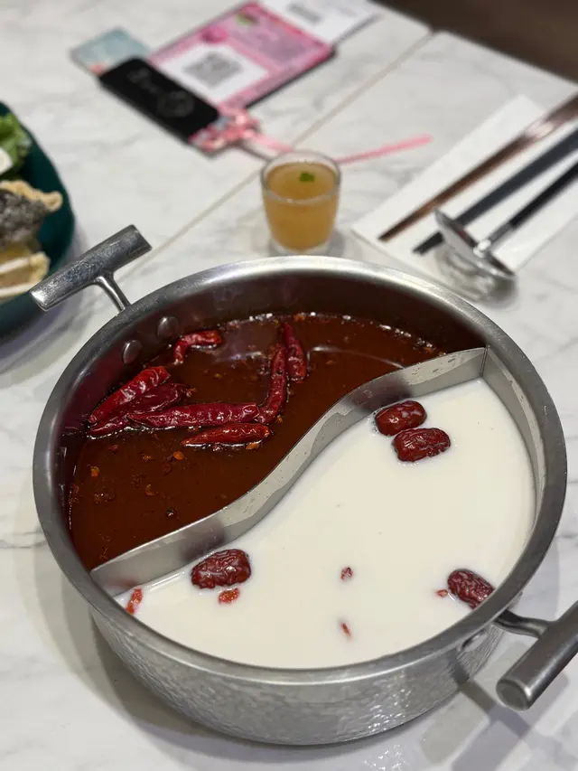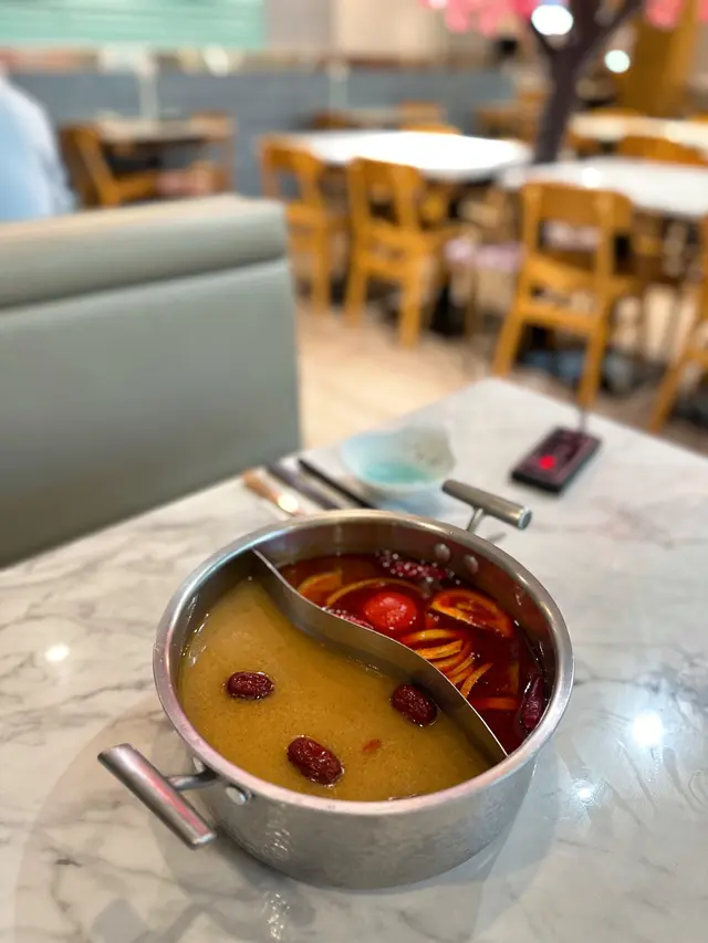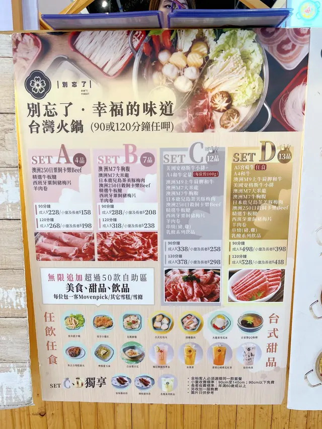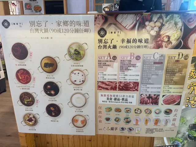 最近去咗荃灣「別忘了」打邊爐,同其他連鎖台式火鍋放題專門店不一樣,依度有好多不同台式火鍋湯底、台式甜品、台式手搖飲品可以無限暢享,今次食完晚飯,仲額外單買咗兩杯台式手搖飲品翻屋企繼續飲。臨走前,仲喺櫻花樹下或許願區下掛上願望卡,祈求願望實現。*此餐廳收取加一服務費。120分鐘仼呻成人Set B 7品(兩人$636),鴛鴦鍋,台式精選酒香麻油雞湯底,麻油香味令湯底飲落好香口,酒香味道清淡,內有雞肉、紅棗、杞子,略嫌湯底比較油膩;惹味香甜台式壽喜燒湯底,內有冬菇、洋蔥,味道甜鹹。澳洲M7牛胸腹(跟餐$0),油脂分布均勻,食落油脂味濃。澳洲M7大米龍(跟餐$0),肉味濃厚。日本鹿兒島茶美豚梅肉(跟餐$0),雖然脂肪比例較少,但肉質嫩滑、不韌。澳洲250日穀飼卡樂Beef (跟餐$0)。精選牛板腱(跟餐$0),食落帶有筋位。西班牙粟飼豬梅片(跟餐$0)。森永牛奶布甸(跟餐$0),奶味醇厚。台式甜品(跟餐$0),包括有乳酪口味仙草雪花冰、檸檬愛玉凍、杏仁果凍、飄雪世界、香草口味雪糕配窩夫、自家製三色QQ粉粿。47款台式飲品(跟餐$0),鮮芋奶綠、別忘了水果茶、香橙白桃烏龍、小芋圓奶綠、爆打雷萌四季春、梅子綠茶、雷萌胭脂桃花紅茶、仙草奶綠、柑桔檸檬沙冰。爆Chill芝青青(單點$42),表面鋪滿奶蓋,味道鹹香,內有青提子肉,味道清甜。小芋波波奶茶(單點$42),內有小芋圓、珍珠、仙草,茶味濃香。…查看更多