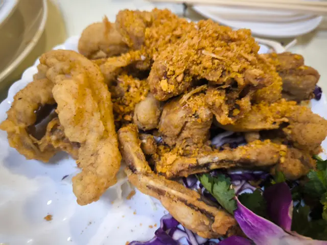 去福華街買玩具,見到呢間餐廳門口相片牆上唐詩泳和黃翠如夫婦都來捧場過,咁就一定要試吓,而且交通非常方便,好適合路痴的我下次再來覓食食完幾個點心和小菜,最值得推薦嘅是👍💖黃金棒棒蝦🦐整盤金黃色澤,感覺很富貴的樣子,蝦身包裹著咸蛋黃醬,用的是虎蝦,蝦皮酥脆,其實咸蛋黃醬炒什麼都是好香!擺盤視覺上也很精緻,簡潔大方,搭配綠色香草和紫花點綴,增添了少少清新感雪山叉燒包大大個,咬開里面很多叉燒餡,味道偏甜一口香麻蘿蔔糕,見個名我以為是細細一個一口食完,點知是一大個切開,炸得好香脆乾燒伊面,好大份量,最後食唔晒打包