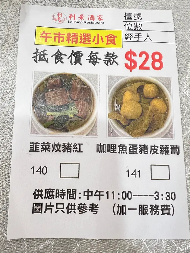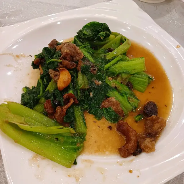 因為家居工程的關係要暫住灣仔一段時間,於是開始了新區揾食工作,首先試的就是利景酒家,經過時見到晚飯套餐選擇多,價錢💰不貴,又有蒸魚食,一於試試。晚餐完全不用訂位,保證有位,服務態度好好,令人賓至如歸。開茶點菜,友善提醒,兩個人不需點太多,🥰很欣賞這樣的服務,不以賺錢第一。點了一個蒸魚🐠套餐,有一條藍瓜子班,一碟豬油渣炒豬乸菜,🤩🤩這菜有個很文雅的名字,莙薘菜,還是第一次見,真是孤陋寡聞了。😅炒菜很快送到,大大碟,好香豬油味,好有小時候的感覺,但菜有點老,有渣落地。😂蒸藍瓜子班好正,條🐠魚大約12兩,洗得乾淨,無鱗😅,蒸得好嫩滑,魚肉白雪雪,見到就想食,兩個人食到舔舔利😋😋。最差是白飯🍚,又硬又不熱,雖然這裡的茶位費和飯錢💰較平易,但感覺就大打折扣,最後有紅豆沙送,算是補償一下。🫣查看更多