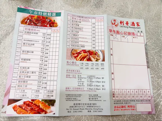 今日12:15我同先生兩個人上去食晏(我先到) (之前一直有幫襯,1個月幾次吧),2樓目測無晒2人枱,知客小姐問搭枱得唔得,我唔係咁想,就叫我上3樓,但跟住背後有位男士要1位,知客指住旁邊4人圓枱稱要佢搭枱(都正常),我馬上反應,咁如果係搭1個嘅話,咁我就搭枱啦,通常酒樓4人抬搭枱2+1或2+2都屬正常,但果張4人圓枱擺左5張櫈5個位,我地坐第1,2個位,好明顯知客小姐要求該男士坐第3個位,就直接坐在我們旁邊,喺香港非高級酒樓早午市時段要搭枱都好正常,只要說明而客人又接受都可以的,但基本上客人之間都會相隔1個位,諗都無諗過直接就坐旁邊,好喇,已經不高興都算喇,誰料第4,5個位還會放1個洗碗兜,我就問知客小姐,呢張枱你地仲會加人?她回,搭枱嘛,搭枱就係咁㗎啦,仲連續講兩次,我無回應,但真氣上心頭,再坐左一陣還是下不了氣,取背囊就走!我同先生匯合後就在附近北海中心3樓見到"鍾菜館",廣告板見午市時段大中小點一律7折,即管一試,呵,簡直意外發現,酒樓樓底非常高,佈置大氣環境非常舒服,以為好貴,最後食到飽飽連折扣係$247,更重要係食物好好味。非常感謝利景酒家給我機會發現灣仔"鍾菜館"這間咁正嘅酒樓,我發誓不會再幫襯 灣仔利景酒家🙅🙅🙅查看更多