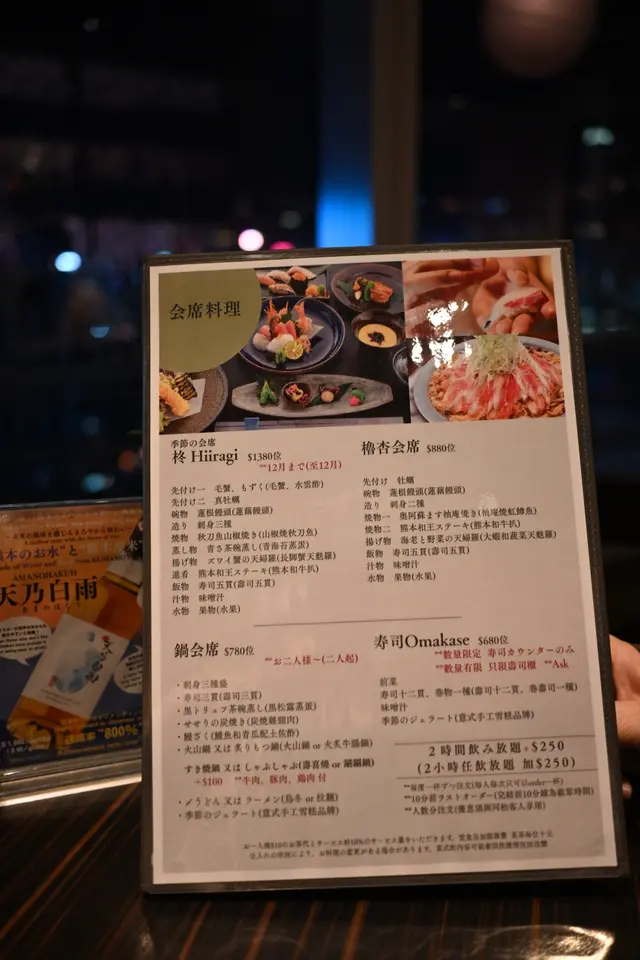 香港的夜景總是令人心醉神迷。今晚,我和朋友於 iSQUARE 國際廣場高層的割烹櫓杏 Kappo ro ann,在維港璀璨夜色下,度過了一頓令人難忘的晚餐。這家餐廳坐擁絕佳視野,尤其在跨年倒數時,更是觀賞煙花的絕佳地點!說到跨年,餐廳在 12 月 31 日特別推出了跨年活動,讓您在窗邊位置欣賞煙花。窗邊位置每位最低消費為 $1000,其他位置則為 $800。當天分為兩個時段,第二時段為晚上 8:30 至 9:00 入座。請務必提前預訂,以免錯過這難得的機會!割烹櫓杏最大的特色,是它是香港唯一的九州熊本主題餐廳,大部分食材皆從熊本直送,保證新鮮!我們點選了鍋會席套餐,每位 $780,食材非常豐富:包括了燒赤鯥、劍魚和蝦刺身,三款鮮味十足的壽司(中拖羅、油甘魚、吞拿魚蓉),以及黑松露蒸蛋,口感滑嫩,香氣撲鼻!此外,還有炭燒雞頸肉、鰻魚和青瓜配土佐醋。當然,最引人注目的莫過於熱騰騰的火山鍋,大量豚肉堆疊成山,搭配烏冬,最後以海鹽牛奶雪糕及生日畫碟作結。值得一提的是,若您是壽星,在這裡慶祝生日,餐廳還會提供免費的生日畫碟服務,讓您的生日更加難忘!還有多款日本傳統套餐已經開始接受預訂櫓杏御節料理(限定50套)$1280 港幣壽喜燒套餐:$1388壽司(5-6 人份):$2388壽司(3 人份):$1288…查看更多