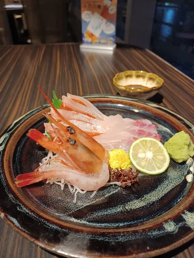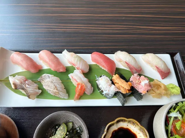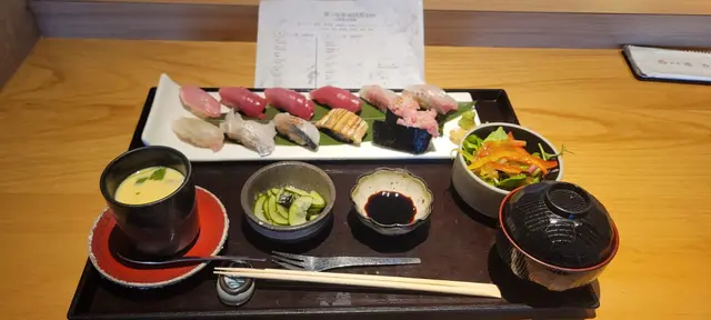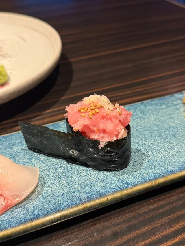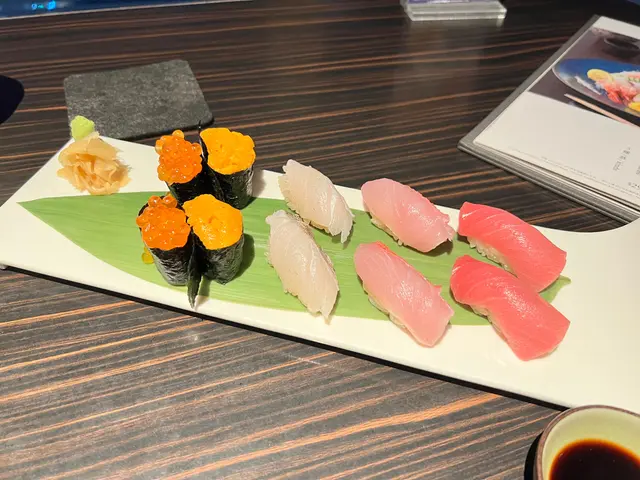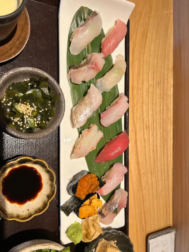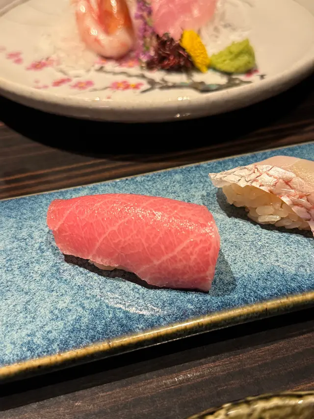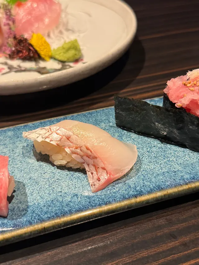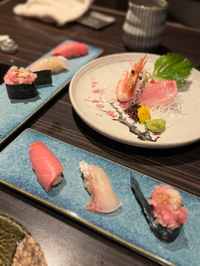 水沙津以熊本阿蘇名水調製,搭配新鮮莫札特野菜,入口清甜爽脆,賣相清新,為餐單開啟輕盈序幕。刺身三種包括赤身、甜蝦及真名鰹,魚肉鮮嫩,甜蝦甘甜,搭配醬油及山葵,味道純粹。壽司五貫選用三文魚子、海膽等食材,米飯軟硬適中,海產新鮮,展現日式料理的細膩。.