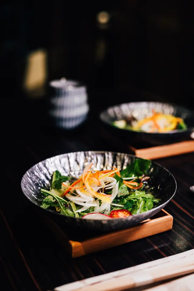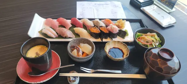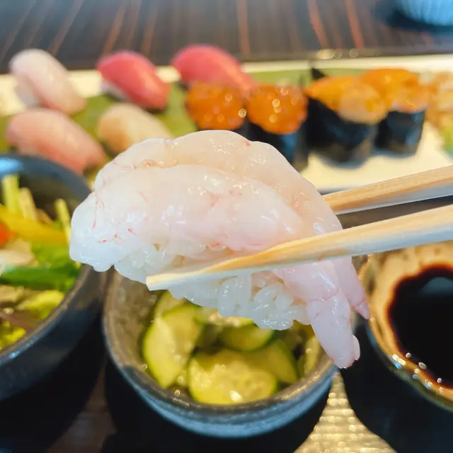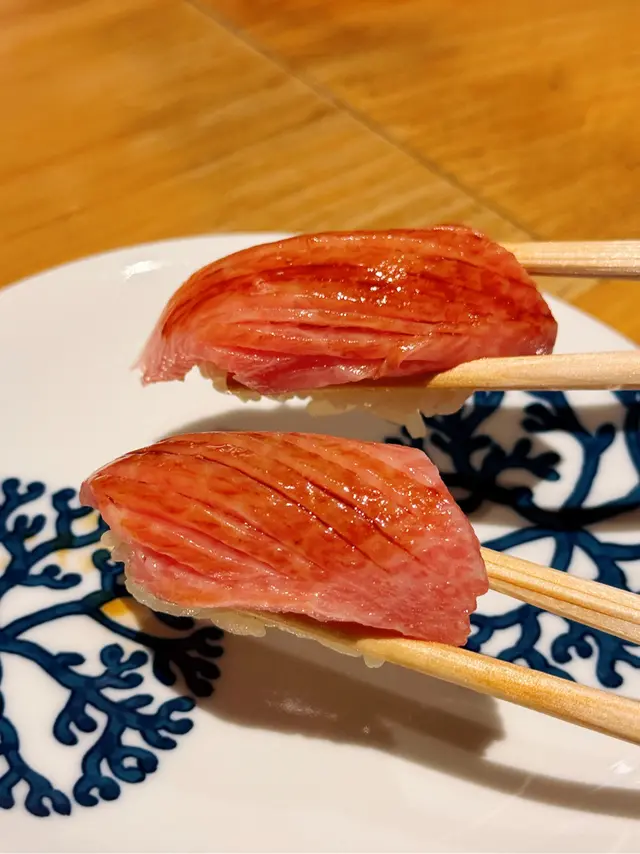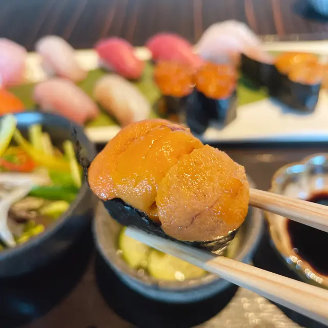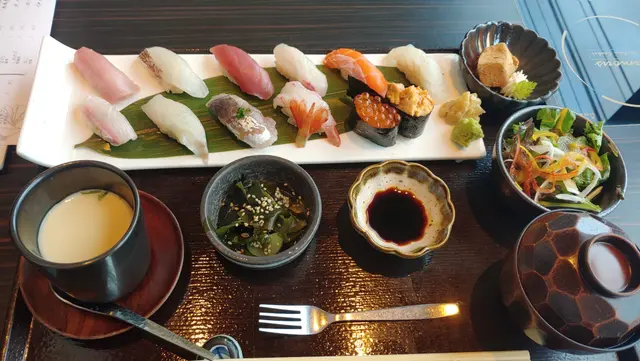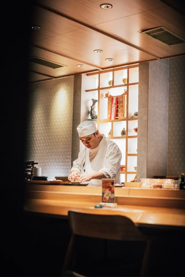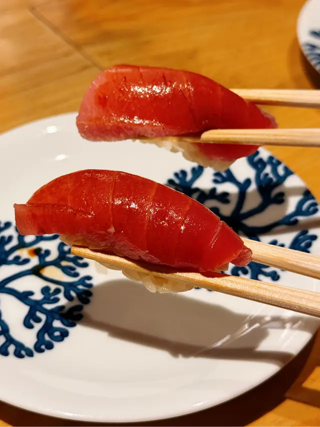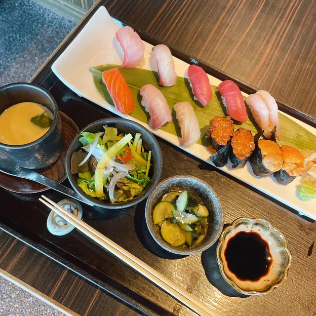 水沙津以熊本阿蘇名水調製,搭配新鮮莫札特野菜,入口清甜爽脆,賣相清新,為餐單開啟輕盈序幕。刺身三種包括赤身、甜蝦及真名鰹,魚肉鮮嫩,甜蝦甘甜,搭配醬油及山葵,味道純粹。壽司五貫選用三文魚子、海膽等食材,米飯軟硬適中,海產新鮮,展現日式料理的細膩。.