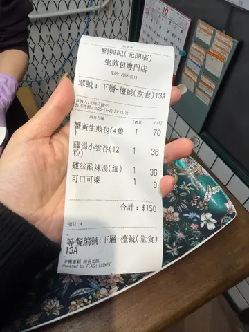 元朗劉興記 暖胃小確幸先叫一籠蟹黃生煎包,等嘅時候聞到陣陣焦香,心都暖晒。生煎包一上枱,個底金黃酥脆,咬開嗰下「咔嚓」一聲,蟹黃汁順住嘴角流,肉餡鮮甜彈牙,4隻份量夠晒飽肚。跟住叫嘅雞湯小雲吞,湯底清鮮,雲吞皮薄餡靚,12粒食落滿足。本來想叫熱飲,後尾貪凍叫咗可樂,配埋雞絲酸辣湯就啱晒——湯底夠酸夠辣,雞絲滑嫩,細碗份量啱啱好,唔會太滯。150元食到咁有水準嘅生煎包同湯品,真係抵到冇朋友。店員態度親切,雖然人多但上餸夠快,下次經元朗一定再嚟幫襯。