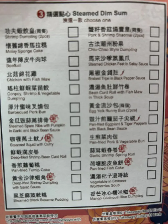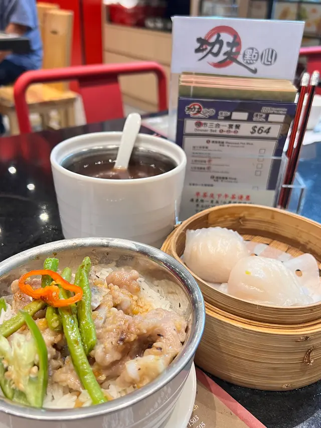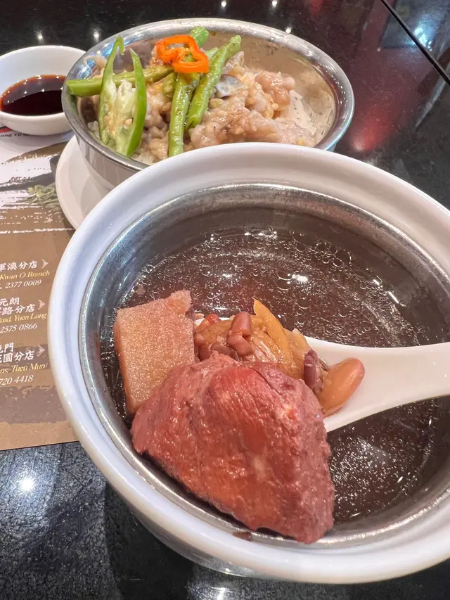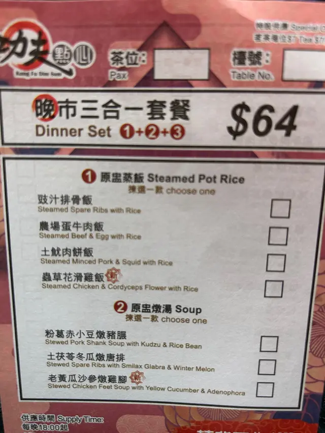 📍元朗功夫點心2024/12/13 。星期五入到嚟元朗,喺又新街落巴士,直行見到好多食店,都幾吸引,但我專注想食功夫點心,因為晚市三合一套餐更加吸引🤩(1)原盅蒸飯@四款選一(2)原盅燉湯@三款選一(3)精選點心@任選一款呢個份量已經好飽肚。🔆🔆🔆🔆🔆🔆🔆🔆🔆🔆🔆🔆🔆🔆🔆門面以紅色為主,特別搶眼,特別醒神。🔆🔆🔆🔆🔆🔆🔆🔆🔆🔆🔆🔆🔆🔆🔆蒸飯系列@蟲草花蒸滑雞飯,滿滿雞肉蓋過飯面雞肉嫩滑,但醃味太重 ,失去雞本身味道☀️☀️☀️☀️☀️☀️☀️☀️☀️☀️☀️☀️☀️☀️☀️燉湯系列@老黃瓜沙参燉雞腳湯,呢個湯頂呱呱熱辣辣,十足材料,味道鮮甜,似媽媽的味道唔覺有放味精,飲完唔口渴。真係回味無窮。☀️☀️☀️☀️☀️☀️☀️☀️☀️☀️☀️☀️☀️☀️☀️點心系列@古法潮州蒸粉果,玻璃皮粉果,精瑩通透餡料就知道用料充足,非常飽滿,餡料有我最鍾意香菜、沙葛,花生、白蘿蔔粒,粉果嘅精髓盡在顯現。👍飲啖香片熱茶,享受其中 。…查看更多