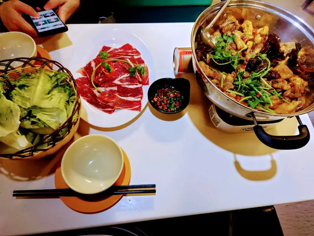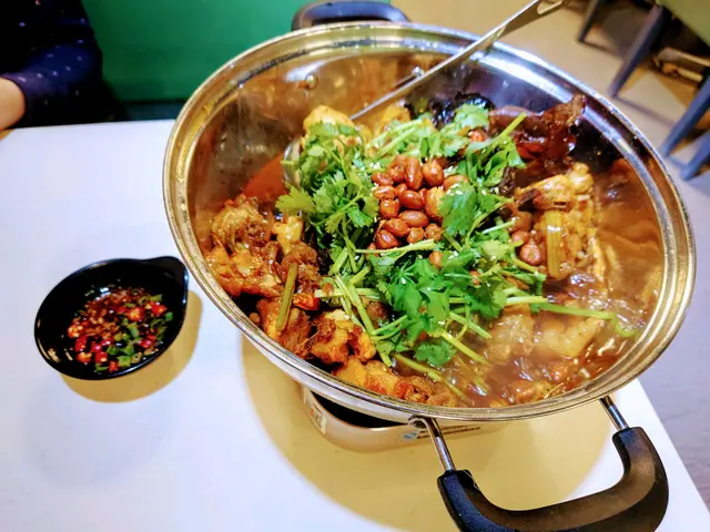 辣雞煲牛肉一碟菜一兜藍妹啤酒一支