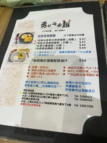 上環勇記海南雞飯是一家深受食客喜愛的餐廳,以其正宗的海南雞飯而聞名。位於香港上環的這家小店,雖然空間不大,但總是熱鬧非凡,吸引了附近寫字樓和遊客前來品嚐。菜單特色- **海南雞飯**:餐廳的招牌菜,選用新鮮的雞肉,經過特殊的烹調工藝,肉質鮮嫩,搭配香濃的雞油飯和特製醬汁,讓人一試成主顧。- **椰子雞湯**:用雞骨熬製的湯底清淡而滋補,十分適合搭配主菜。- **配菜**:如黃瓜片、豉油雞翅等,讓整體餐點更加豐富。