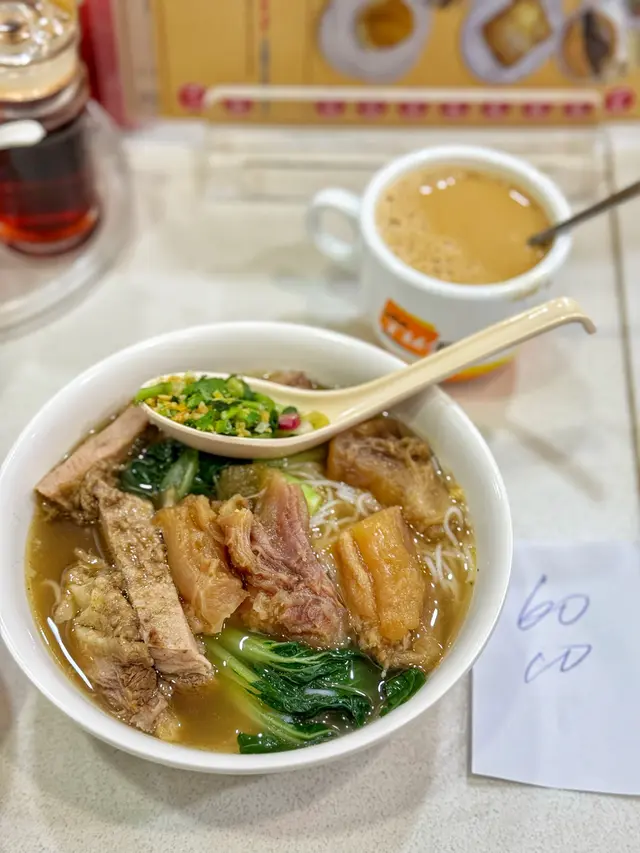 真係好鍾意香港地道茶餐廳。呢一日好早11點喺銅鑼灣附近,搵咗呢一間粉麵店食一個午餐。叫咗牛腩牛筋米粉,熱咖啡 $70牛筋煮得相當軟腍,超級香牛肉味,一絲一絲,油脂豐富。熱咖啡都係普通熱咖啡味道。餐廳一早就播住六七十年代嘅舊香港歌曲,真係特別有一番風味。香港傳統茶餐廳真係買少見少,但係我總覺得呢啲傳統粉麵店做出嚟嘅牛腩牛肉係特別香滑,希望香港人都多多回味返同支持。餐廳店面唔大,但係好企理,下次去銅鑼灣都會再幫襯。查看更多