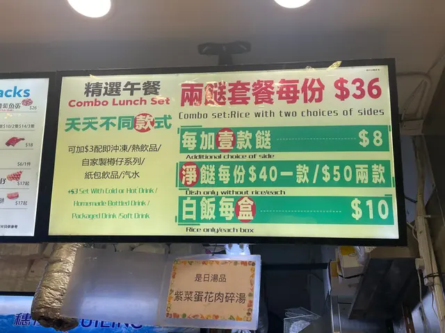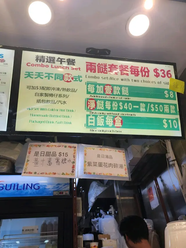 今日係附近整完回鄉證,見到呢間兩餸飯,唔想煮飯嘅我決定買幾個餸番屋企,自己再煲白飯。見到晚市5點後可以加$5可配樽仔飲品或任何飲品,自家制無糖蜂蜜鮮檸檬水同無糖金羅漢果雪梨茶都係無添加防腐劑。呢到中上環食lunch都唔平,見到好多係附近番唔工嘅OL都排哂隊,打工仔必備食店。蒜蓉墨魚仔蒸粉絲,蒸扇貝,避風塘炒蝦非常之適合買返屋企加餸。蒸水蛋入口滑嘟嘟;萵筍炒牛肉,萵筍非常爽脆,牛肉嫩滑。蠔油冬菇豆腐冬菇炆得非常之林,好入味。薯仔咖喱雞雞肉嫩滑,薯仔粉嫩,咖喱送飯一流。芋頭炆排骨份量好多,芋頭軟林。碗仔翅好足料,入口順滑。薑汁蕃薯糖水天氣凍凍地,飲完成身暖笠笠,蕃薯香甜軟林。…查看更多
