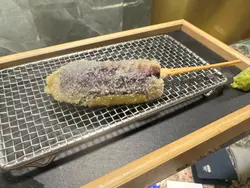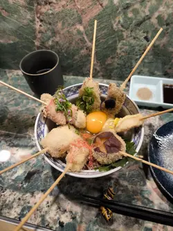 位於九龍城的這家日式串揚專門店,以道地大阪風味為主題,主打刺身與串揚的完美搭配,佐以燒酎怡情,讓人恍如置身大阪街頭。店內空間雖不大,但佈滿大阪街景牆紙,搭配整潔高腳吧檯座位,營造出濃濃的東瀛氛圍。還有廚藝超高、親切和藹又健談的主廚老闆渡邊先生,把他在香港40年煮食的經驗和我們娓娓道來,讓我們親身經歷了一次賞心悅目的大阪串揚之旅。蒜頭木魚漬蒜片爽脆入味,木魚香氣十足,十分開胃。中濃汁檸汁配椰菜椰菜蘸着滑順果香的日式中濃汁與清新檸汁,能巧妙化解炸物膩感。七味魚翅馬面魚乾火候精準,佐以沙律醬更顯風味。秋刀魚二重奏一款製成酥脆卷物,外層輕薄脆口,內裡柔軟;另一款則為鮮美刺身,蘸特調醬汁凸顯魚鮮。串揚即點即炸的串揚粉漿薄如蟬翼,完美鎖住食材原味:厚切宮城縣和牛牛舌:口感爽彈,肉香濃郁。沖繩直送苦瓜:清苦回甘。高知青椒仔:清新爽脆。福井里芋:綿密細膩。時令海鮮七品盛合擺設十分漂亮!包含鰻魚、沙椎魚、魷魚、帆立貝等,其中磯煮鮑魚彈牙鮮甜,炸衣輕薄不膩。極上刺身杯三文魚滑潤、赤身、帶子甘甜,佐以爆漿三文魚籽與米飯,層次豐富。南高梅茶漬飯以柔軟米粒吸收湯汁,梅子酸香點亮味蕾,熱辣辣的非常好味!千德純米大吟釀吃完不同的串揚後,我們叫了這瓶大吟釀淺酌。這款呈現琥珀光澤的純米大吟釀,開瓶即飄散優雅果香,入口時酒體綿柔滑順,收尾則帶有淡雅米麴的回甘。清澈酒液真能洗去油炸物的餘膩。整體而言,主廚對食材堅持與技藝講究,搭配親切互動,成就了我們今晚一場視覺與味覺的雙重饗宴。這裏還有不同的午餐定食、omakase 午餐及晚餐等。下次我也要來再試吓呢。…查看更多