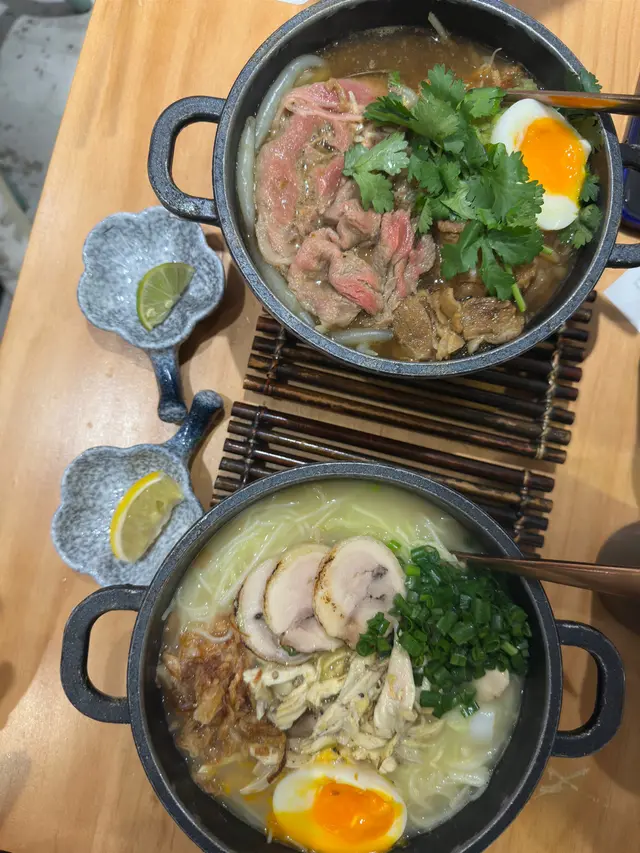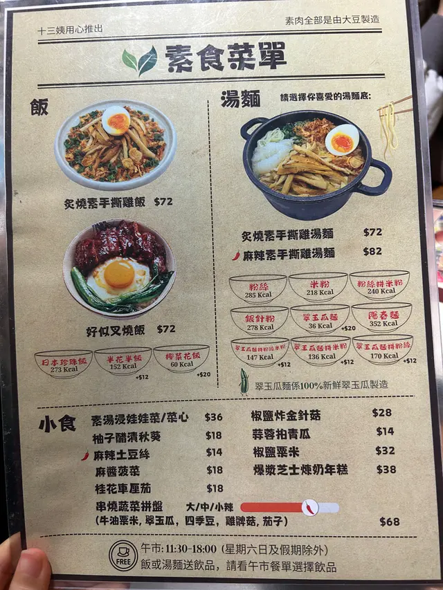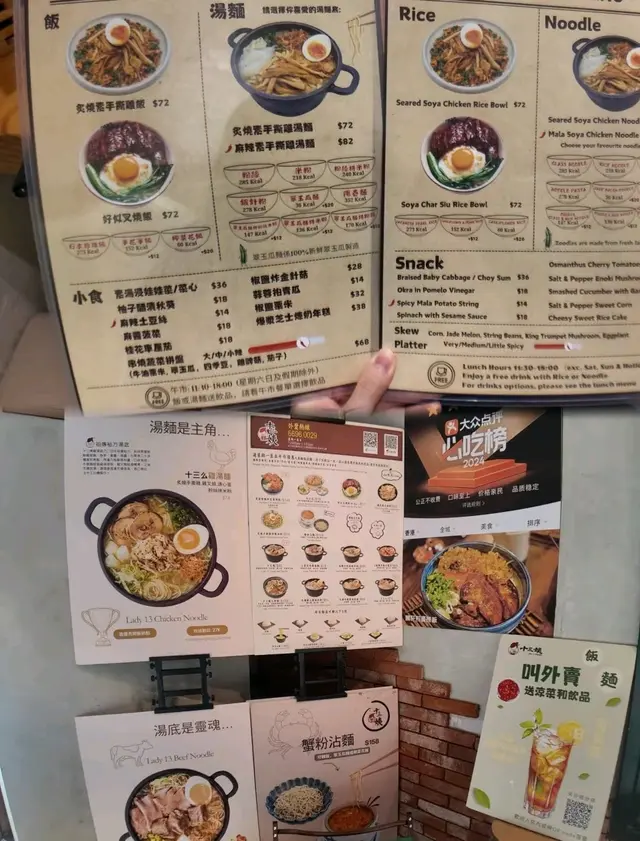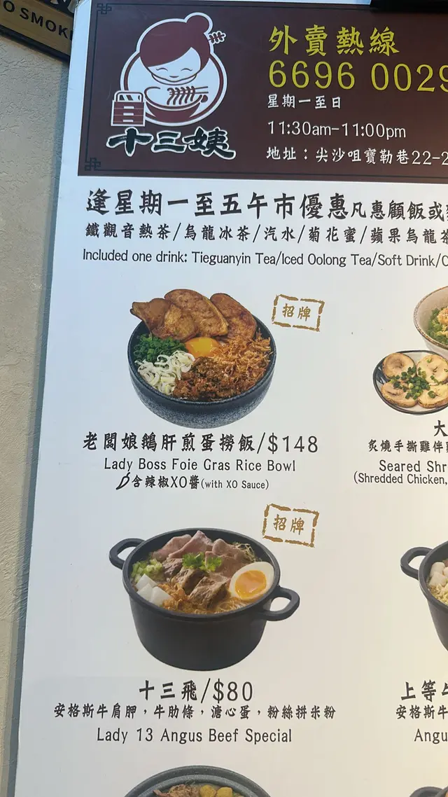 同朋友唔知食咩好就隨便揀咗尖東站附近一間港式店十三姨試下,舖不算大但坐位還可以,枱下亦有提供籃子給放包包。選單上主要就是雞、牛、鵝肝、蛋配以不同的粉麵(粉絲/米粉/銀針粉/陽春麵/翠玉瓜麵/六蔬等)及飯(米飯/椰菜花飯等)秘製嘅湯底,配以不同嘅粉面,感覺沒有味精,濃郁但不覺膩,我點的是十三么內有手撕雞、雞叉燒、糖心蛋配雙粉,粉絲及米粉都十分爽口幾啱我胃口另外佢仲有蟹粉麵及串燒等等賣相都